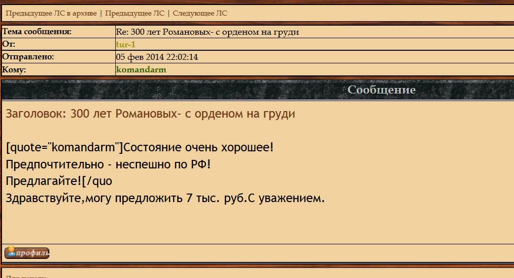 Re: 300 лет Романовых- с орденом на груди komandarm - 06 фев 2014 18:09.31 × Мини профиль пользователя komandarm Сообщения: 1442 Зарегистрирован: 15 июн 2010 23:52.19 Статус: Не в сети - 06 фев 2014 18:09.31 #4611852 В ЛС от tur-1 поступило предложение в 240дол.Он поставил бы и здесь, но у него нет доступа к разделу!Ставки делайте пожалуйста в долларах!!!