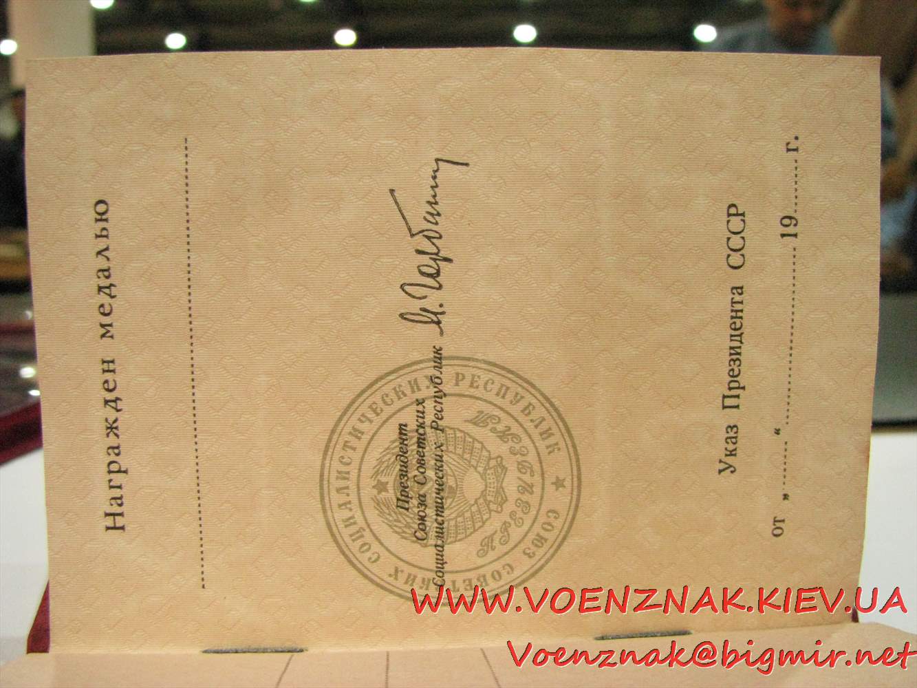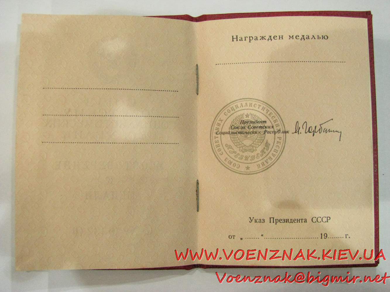 Бланк удостоверения к медали с подписью президента СССР Горбачева