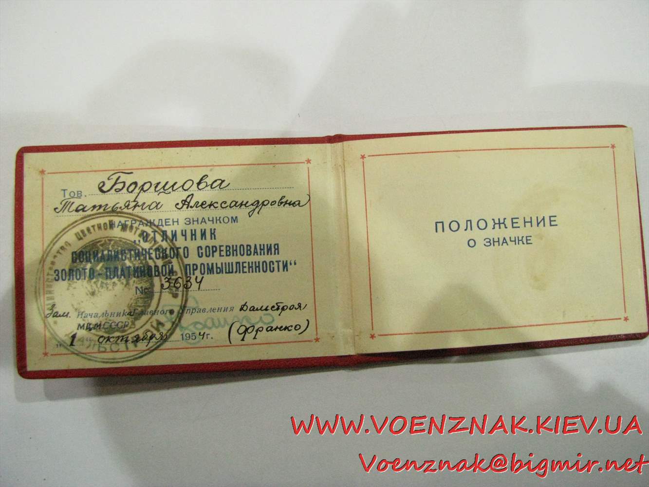 Знак "ОСС Золотоплатиновой промышленности СССР", №3634, с документом на женщину