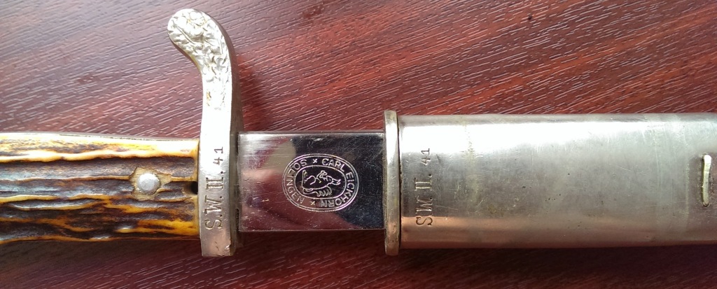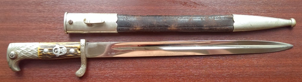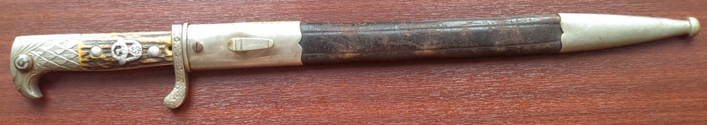 Хорошее состояние, клинок без зазубрин, мелкая сыпь по никелю, вид не портит. Ножны в аналогично сохране, кожа целая. рукоять с рабочей кнопкой без изъянов. Кнопка работает. Парник 35 000 рублей