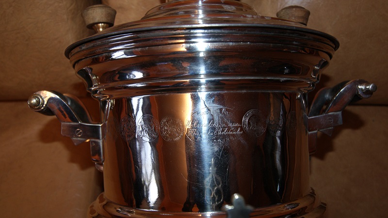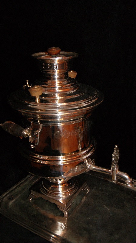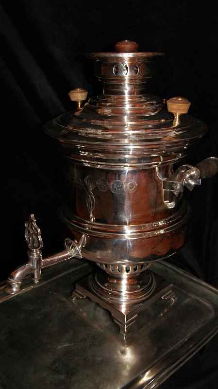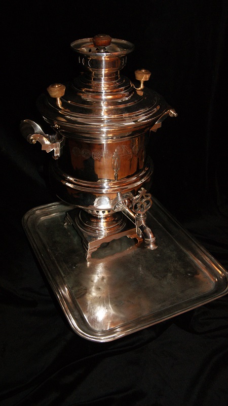Самовар обьемом 5-6 литров.Нормальный вариант для пользования.Было пару микротрещин,залужены изнутри.Колосник и лужение в порядке.Крышка зольника отсутствует.верток воду держит,не течет.Клеймение хорошее не затертое.Приложу к самовару мельхиоровый поднос,прямоугольный,