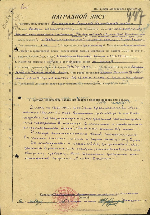 Слава-2,3 ст. на одного кавалера: Семикин А.К., гв. красноармеец, сапер.