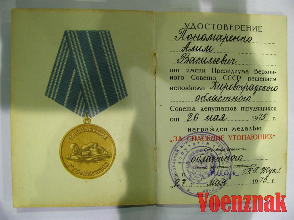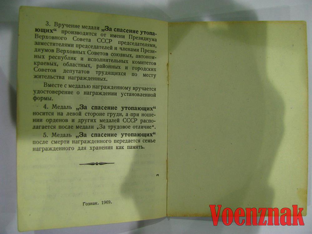 Вашему вниманию предлагается удостоверение к медали "За спасение утопающих".