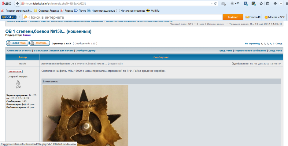 31 марта приобрёл у "макарыча" данный знак и сразу отправил ему деньги. Он, соответственно, сообщил, что предмет в пути. Через несколько дней мне позвонили и попросили прийти в ...(но не на почту) для дачи объяснений по поводу того, что и от кого я жду, о чём я сразу проинформировал обоих продавцов. Разумеется, я в отъезде... По идентификатору бандероль покинула сортировочный центр обоих продавцов и ...пустота. Номер трека № 654018 7200 1008. Один из продавцов поднял тему на другом форуме, практически обвиняя меня в мошенничестве. К нему присоединился и "макарыч". Об этом мне сообщили друзья через несколько дней. В теме я постарался вежливо отписаться. Несколько раз просил продавцов сходить на почту и заявить в розыск свои отправления, чтобы, во-первых, снять с себя обвинения по поводу мошеничества, а во-вторых, потребовать обратно свои деньги, т.к. по условиям обоих форумов за доставку отвечает продавец. Но прошло уже достаточно времени, а кроме того, чтобы поднять свой зад и дойти до отделения связи, "макарыч" мне пишет в личку какой-то бред про мою подпорченную репутацию, а на другом форуме bushi пишет о каких-то распечатках телефонных разговоров. Если бы я был "кидалой", стал бы я о чём-то предупреждать этих двух товарищей? Сидел бы ровно и ждал, а через две недели закидал бы их запросами "где, когда и почему?". Мне посоветовали поднять данную тему в рубрику конфликтных, что я и сделал. Прошу форумчан высказаться по данному спору. С уважением ко всем, ВалерийСергеевич.