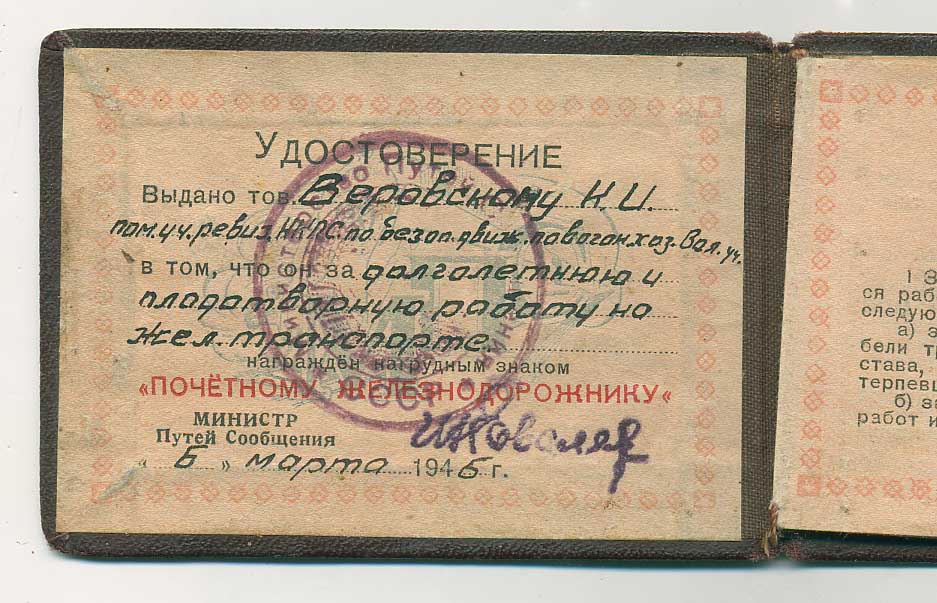 а награждение получил уже от Министра МПС и на удостоверении МПС.