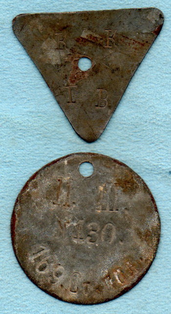 Личный (увольнительный) знак (жетоны) Полковой Школы (Школа Младших Командиров) 169-го Стрелкового полка (до ВОВ), личный " 130, второй знак - К.К. - курсантский (командный) корпус, Г.В. - главный вход.