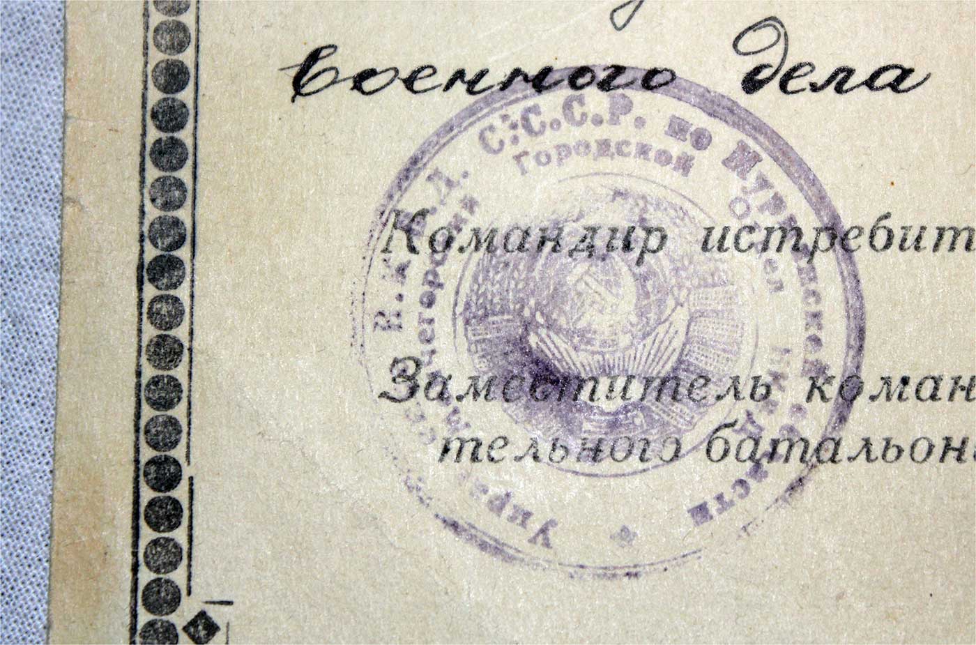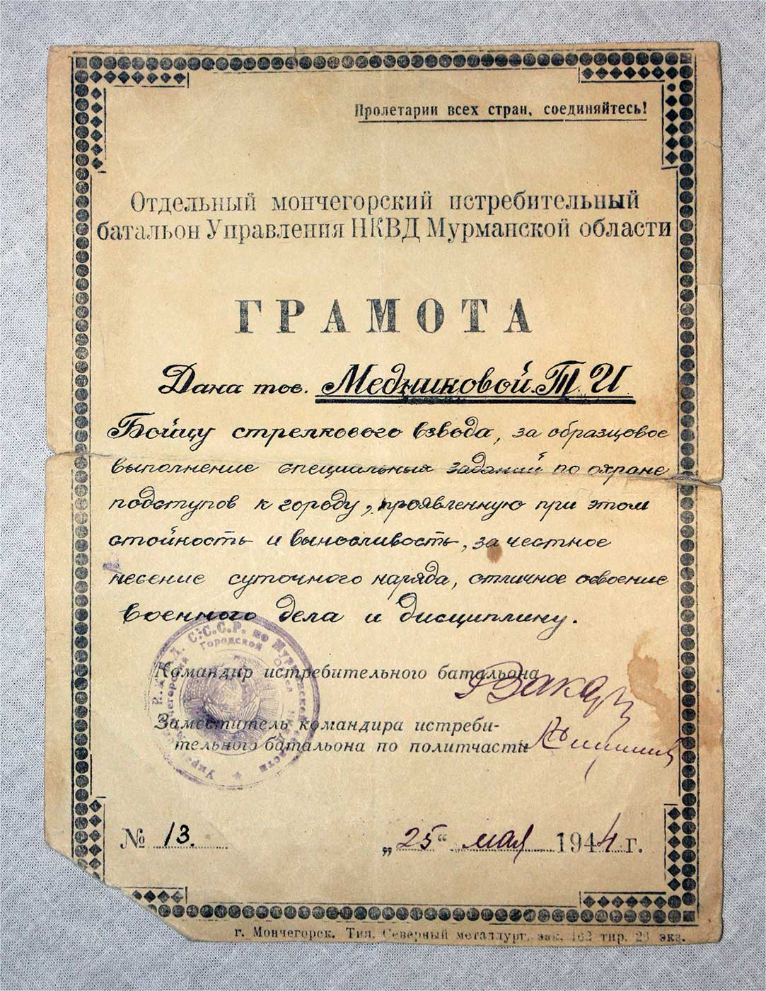Грамота НКВД №13 тир. 26 экз. Бойцу, Истребительный Батальон