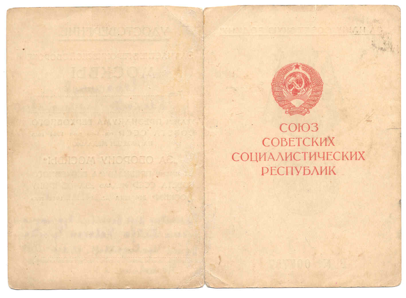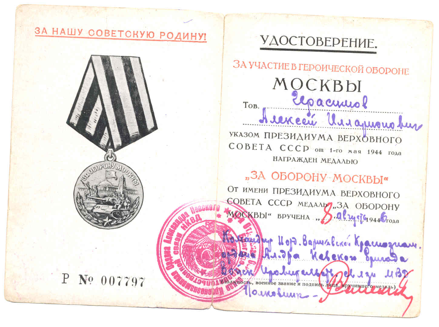 Удостоверение к медали "За оборону Москвы"