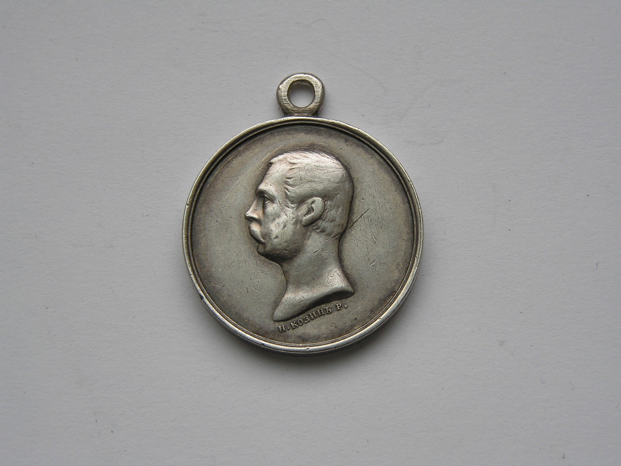 Волосы зачёсаны в сторону лба. Подпись медальера сильно волнистая.