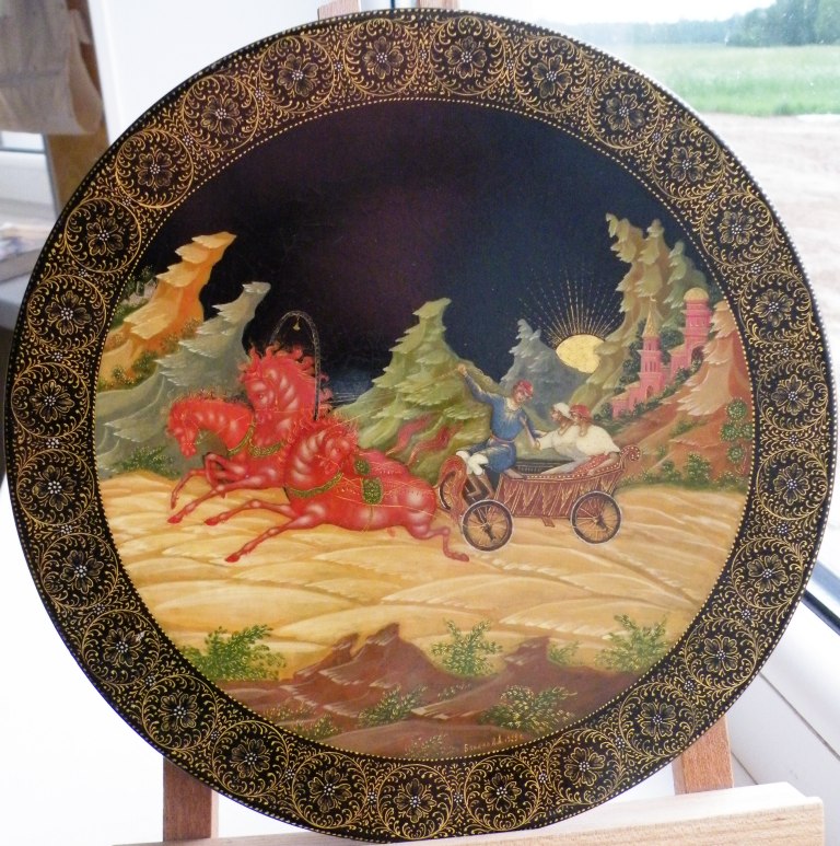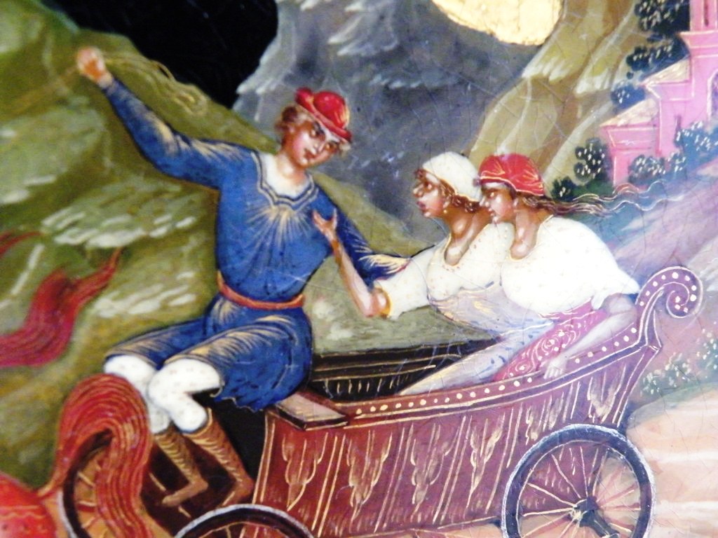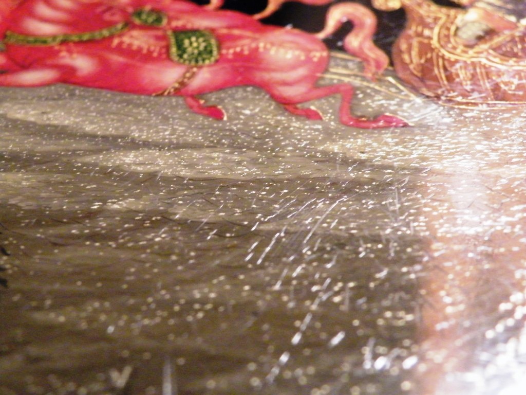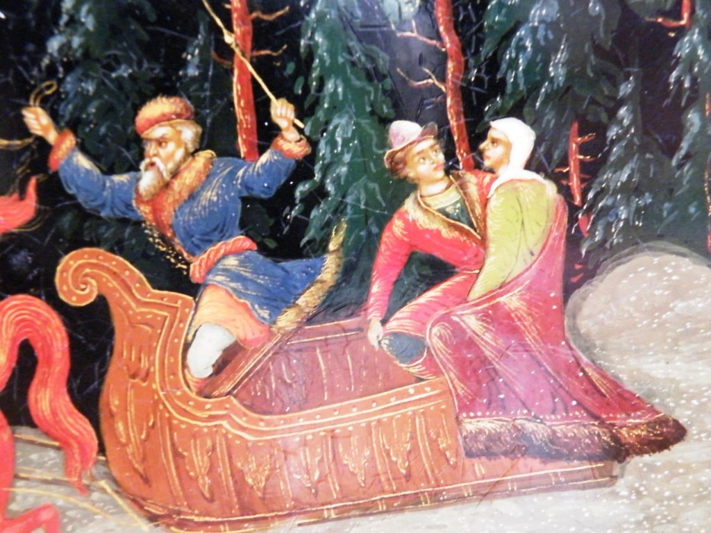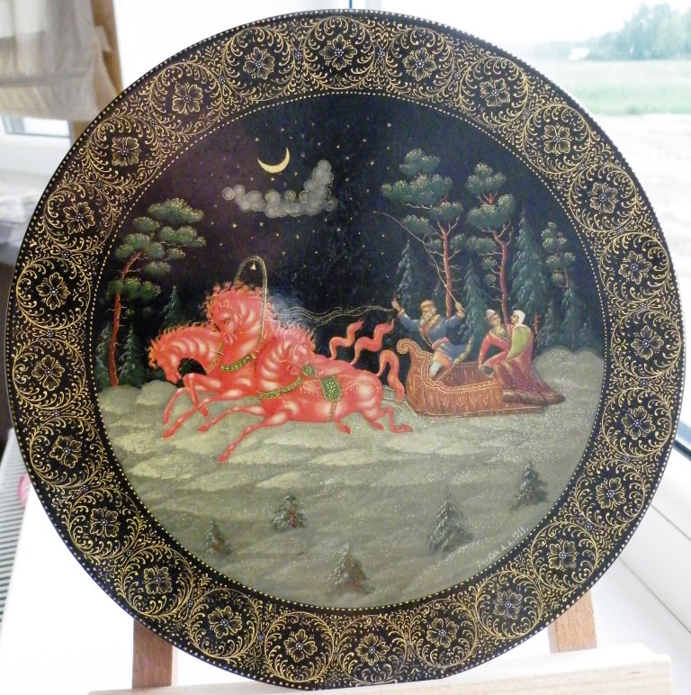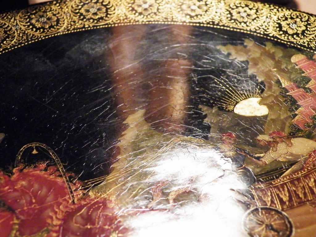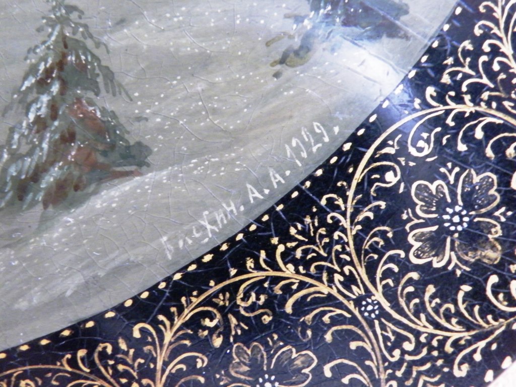 Теперь перейдем к техническим. Как уже пояснил, я долгое время собираю палехские шкатулки. И ни разу ни на одной подлинной вещи того времени не видел такого откровенно лакового (сделанного с помощью специального современного лака "кракле") кракелюра. Могу показать как выглядят подлинные шкатулки того времени, там нет ничего похожего на этот кракелюр. Живопись тоже выглядит откровенно свежей и выполненной на совсем другом техническом уровне, от приписываемой этому автору. Ни на одной из работ Блохина А.А. вы не встретите таких примитивных саней, деревьев, горок. Лица тоже другие, упрощенные, хотя они и удались художнику несколько лучше.