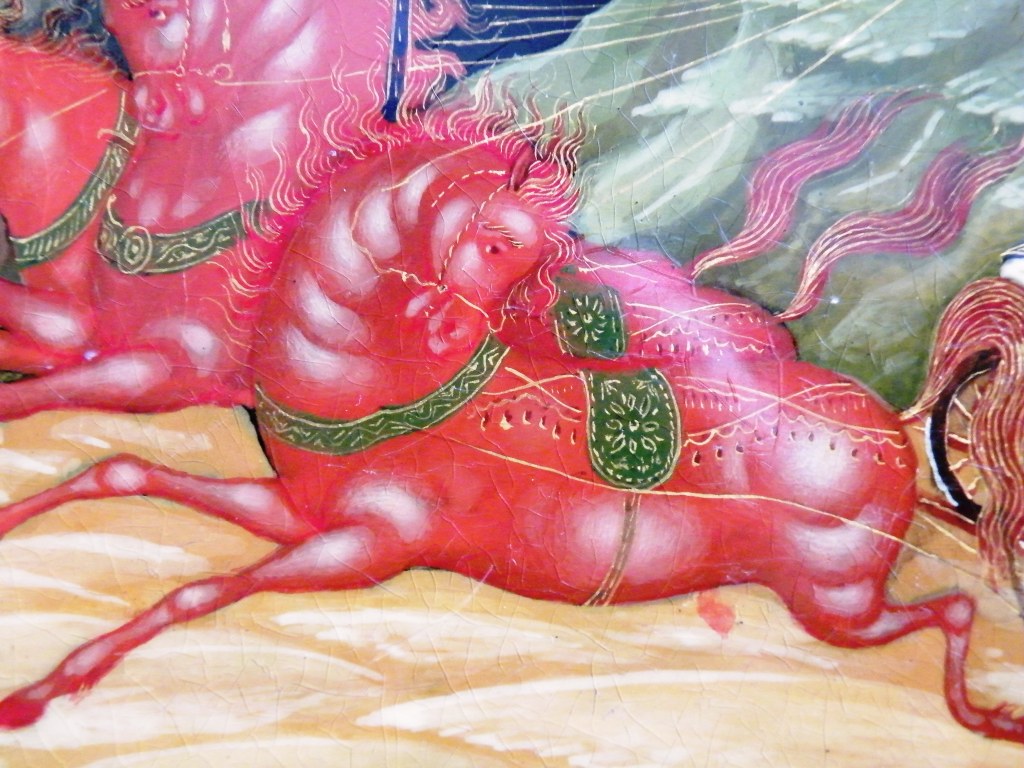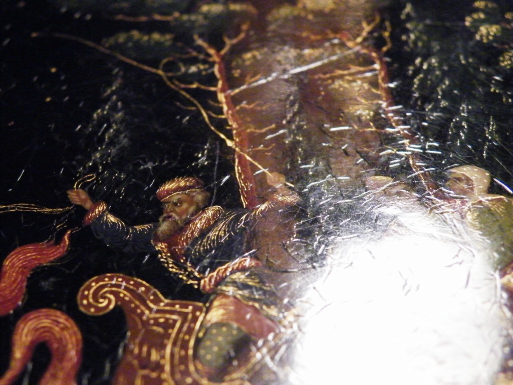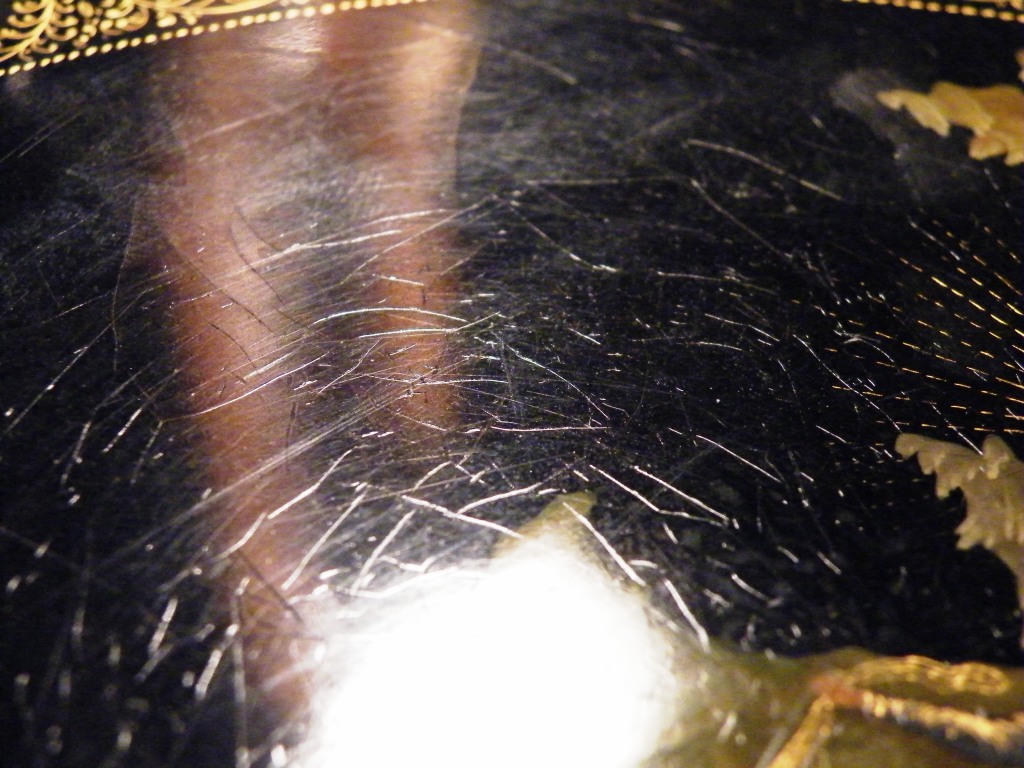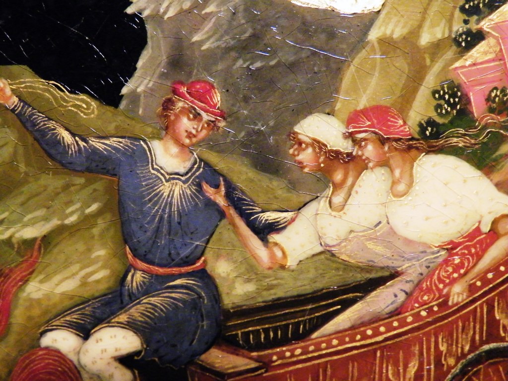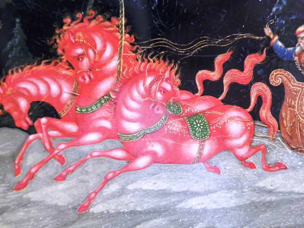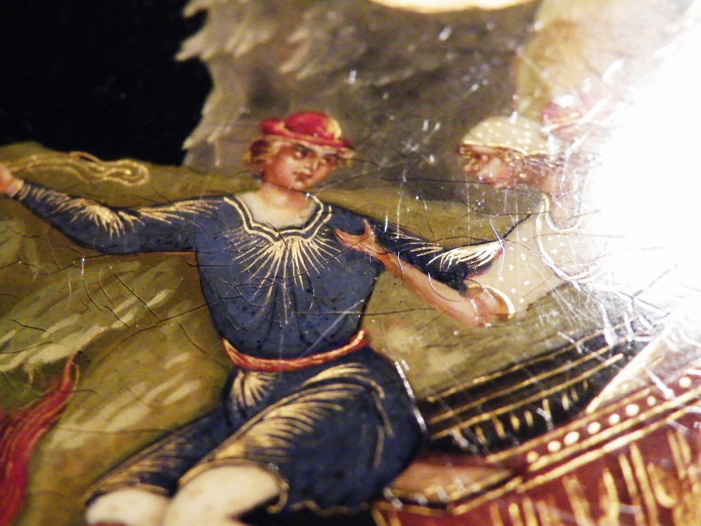 Теперь перейдем к техническим. Как уже пояснил, я долгое время собираю палехские шкатулки. И ни разу ни на одной подлинной вещи того времени не видел такого откровенно лакового (сделанного с помощью специального современного лака "кракле") кракелюра. Могу показать как выглядят подлинные шкатулки того времени, там нет ничего похожего на этот кракелюр. Живопись тоже выглядит откровенно свежей и выполненной на совсем другом техническом уровне, от приписываемой этому автору. Ни на одной из работ Блохина А.А. вы не встретите таких примитивных саней, деревьев, горок. Лица тоже другие, упрощенные, хотя они и удались художнику несколько лучше.