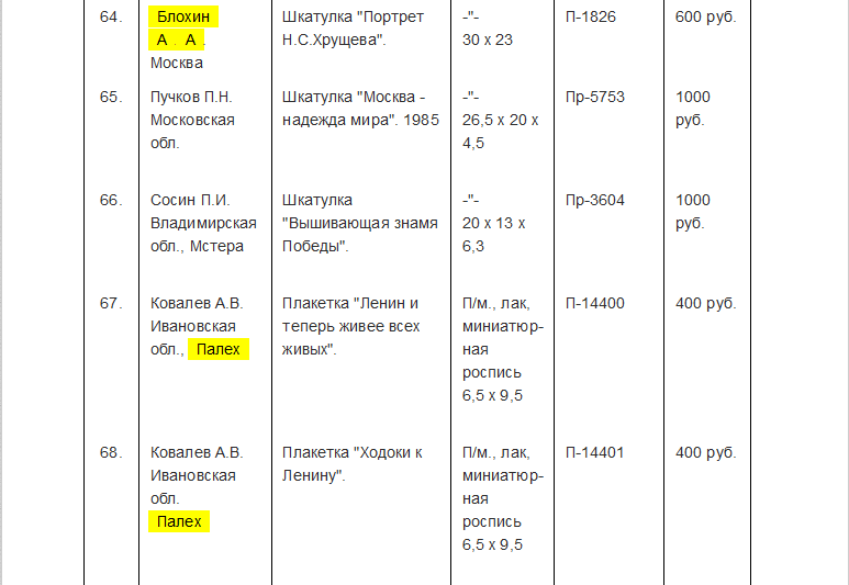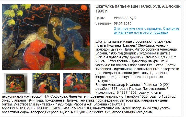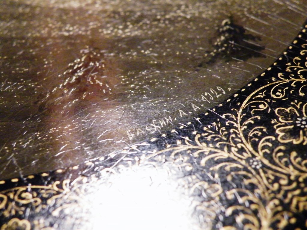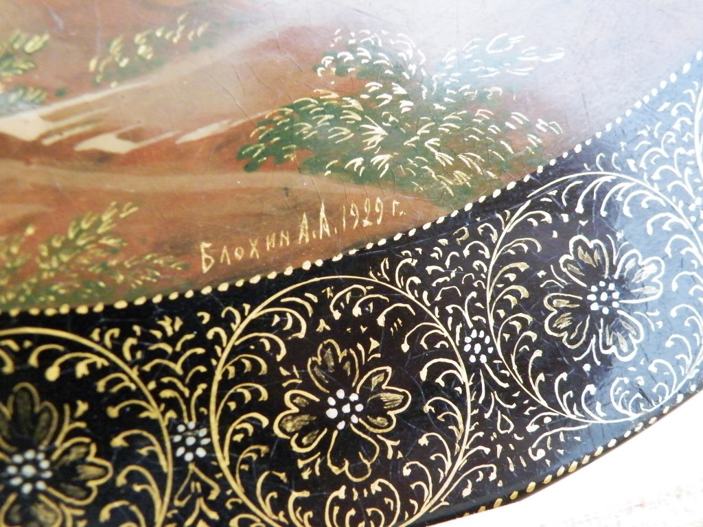 Начнем с того, что на работах А.А.Блохина (как и других мастеров "Артели древней живописи") не могли, наряду с подписью мастера и годом, отсутствовать надписи "с.Палех", номер изделия и "made in Soviet Union" (или "made in U.S.S.R.") на обратной стороне. Это чисто формальные признаки.