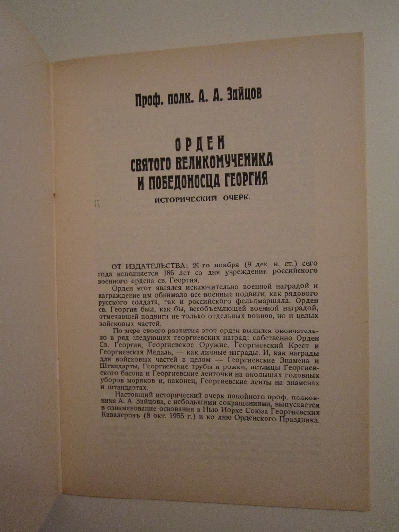 Профессор полковник А.А. Зайцов. Орден Святого Великомученика и Победоносца Георгия. Исторический очерк.
