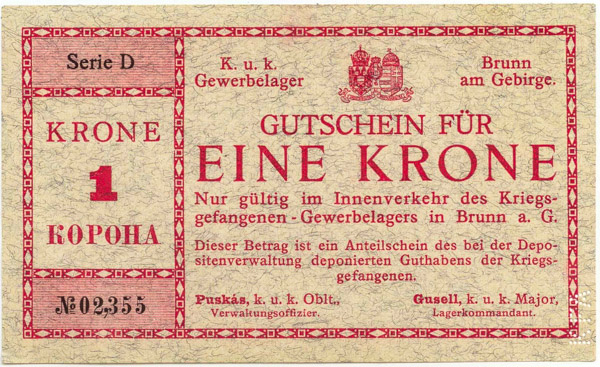 Продажа: Австрия, 1 корона (1915-1918) - лагерь для военнопленных Gewerbelager K. u K. Brunn am Gebirge, перфорация. Продажа по РФ, предложите.