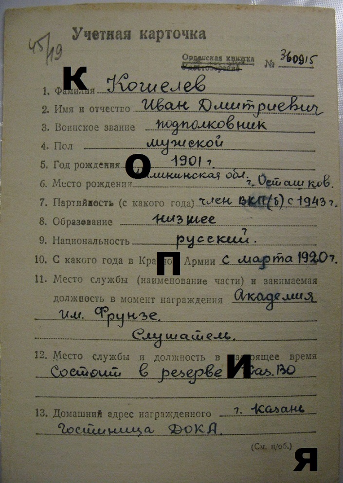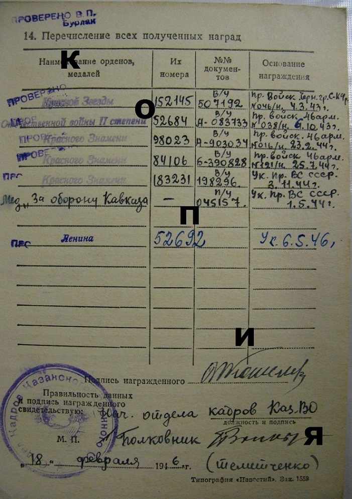Красного Знамени, Суворова, Кутузова, Богдана Хмельницкого, Александра Невского, Ушакова, Нахимова, Отечественной Войны, Красной Звезды, Славы, За Службу Родине в ВС СССР