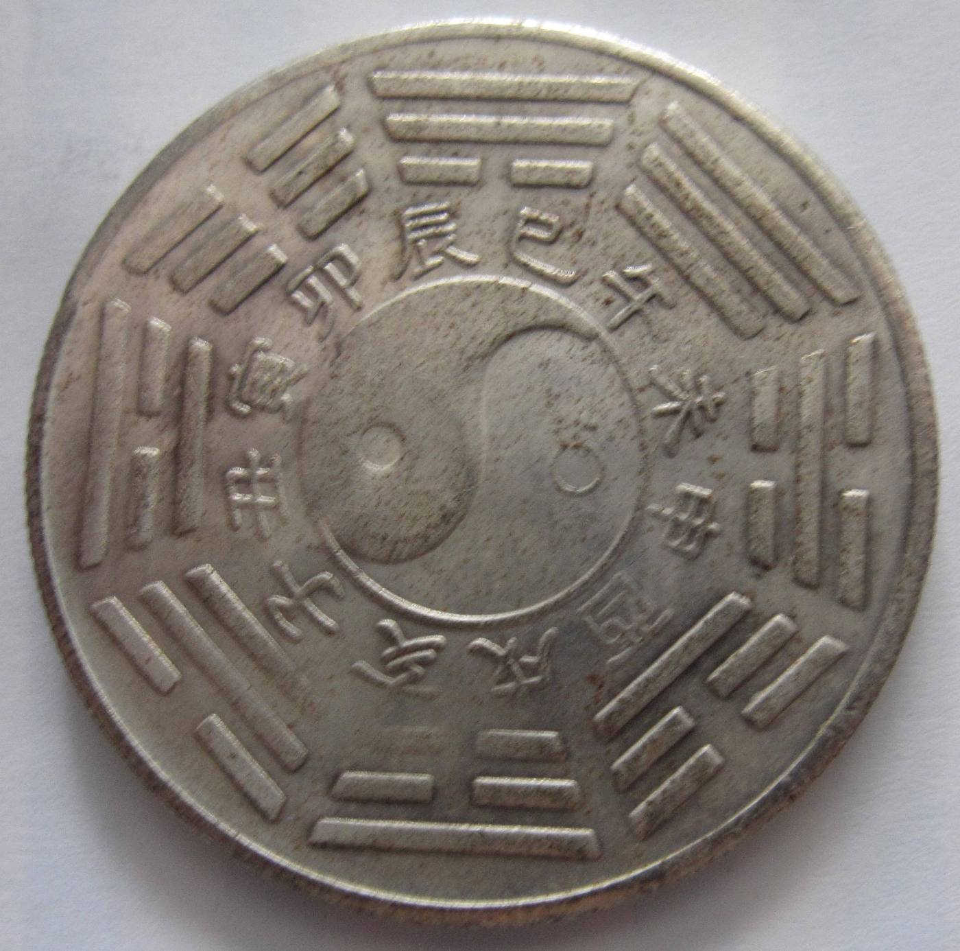 На Иньской стороне монеты, в центре, находится Инь-Ян — (кит. «Тайцзи» или «Небесный пруд») — символ Великого Предела в китайской философии. Инь-Ян является символом начальной точки Ци, дыхания жизни. Это один из древнейших философских символов. Непрерывное существование и гармония со всей вселенной, существующей благодаря уравновешиванию двух противоположных элементов Инь и Ян. Ян — белый — мужской знак; активный; день; символ неба; сила созидания; доминирующий. Инь — чёрный — женский знак; созерцательный; ночь; возникновение жизни; загадка. По кругу вокруг Инь-Ян расположены восемь триграмм — магический оберег от злых духов.