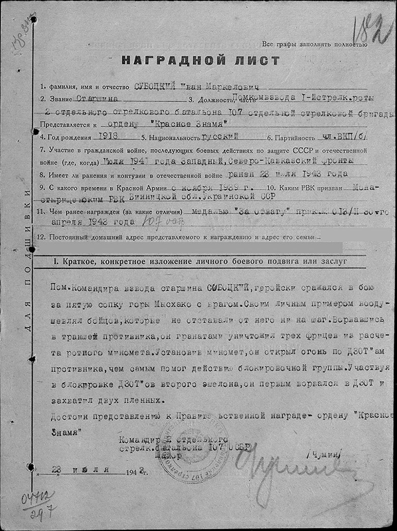 — Застать нас врасплох не удалось. За два дня до этого мы захватили «языка» и знали, что противник собирается сбросить нас в море. Наблюдательный пункт командира бригады Шуклина постоянно был на сопке, а оттуда хорошо просматривались немецкие позиции. Конечно, труднее всего было в первые дни, когда враги рвались к вершине Мысхако. Скажу лишь: я начал войну под Москвой политруком стрелковой роты, затем комиссаром отдельного минометного батальона воевал на Западном и Брянском фронтах. Был под Туапсе, где тоже было нелегко. Но все это никак нельзя сравнить с тяжестью боев на Малой земле, особенно в апреле. Батальонам приходилось отбивать до 10 атак в день. Но противник не прошел. Наши части, хотя и несли большие потери, прочно удерживали свои позиции!