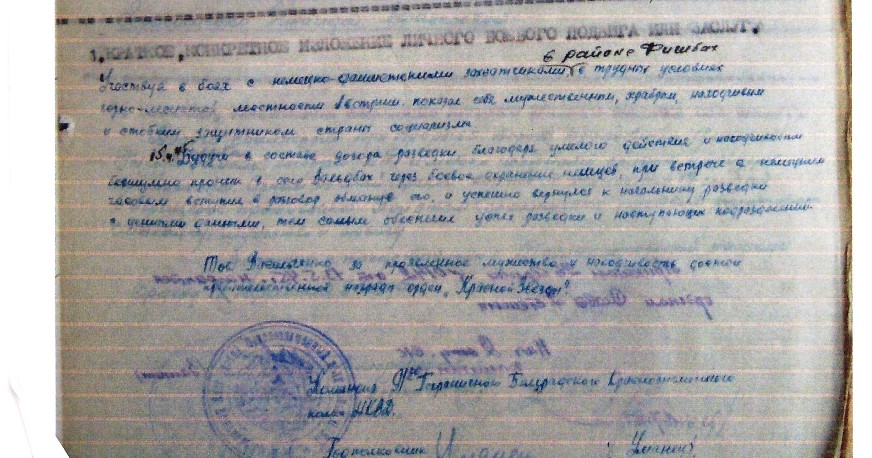 Участвуя в боях с фашистско-немецкими захватчиками в районе Фишбах в трудных условиях горнолесной местности Австрии, показал себя мужественным, храбрым и стойким защитником страны. Будучи в составе дозора разведки благодаря умелым действиям и находчивости проник в село Вальдбах через боевое охранение немцев. При встрече с немецким часовым вступил с ним в разговор, обманув его и успешно вернулся к начальнику разведки с ценными данными , тем самым обеспечил успех разведки и наступающих подразделений.