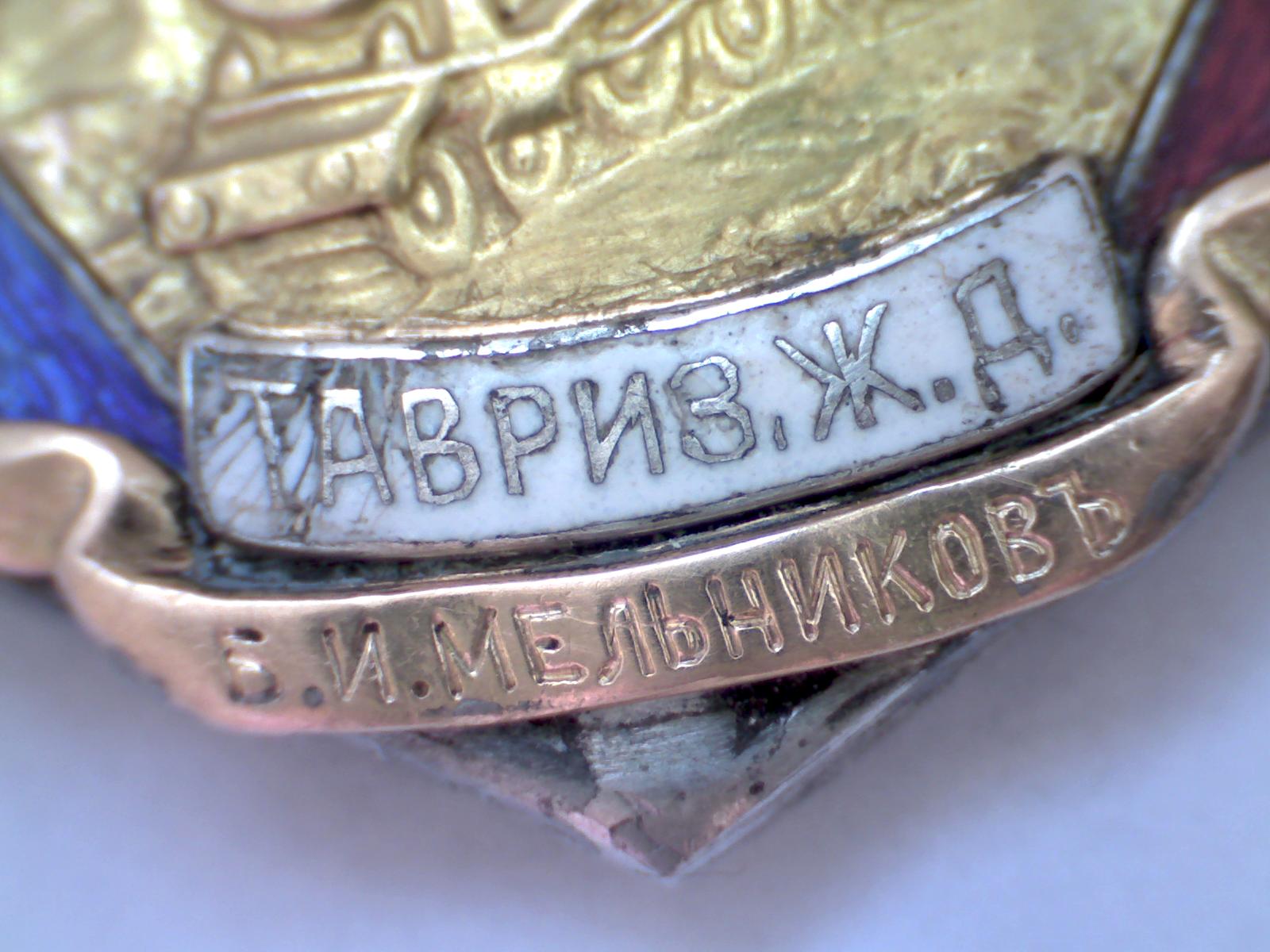 Жетон Общества Тавризской железной дороги. Клеймо 56 пробы. Золото, серебро, эмаль, 16,05 г. Размеры 33,7×26,2 мм. Сохранность на фото.