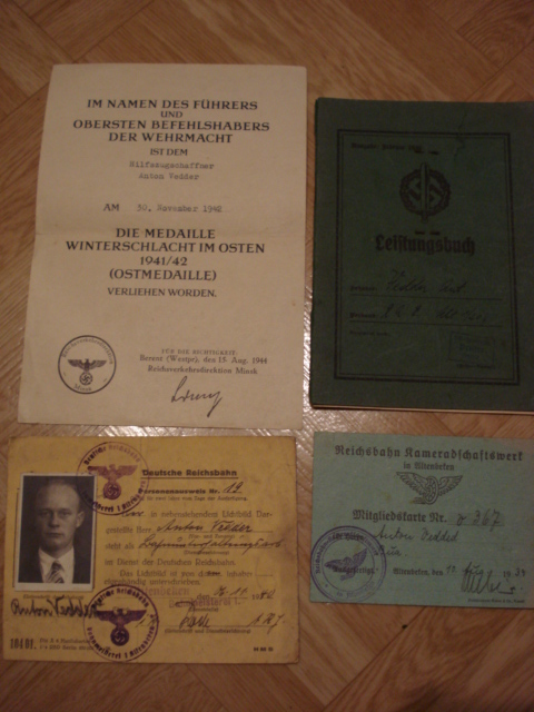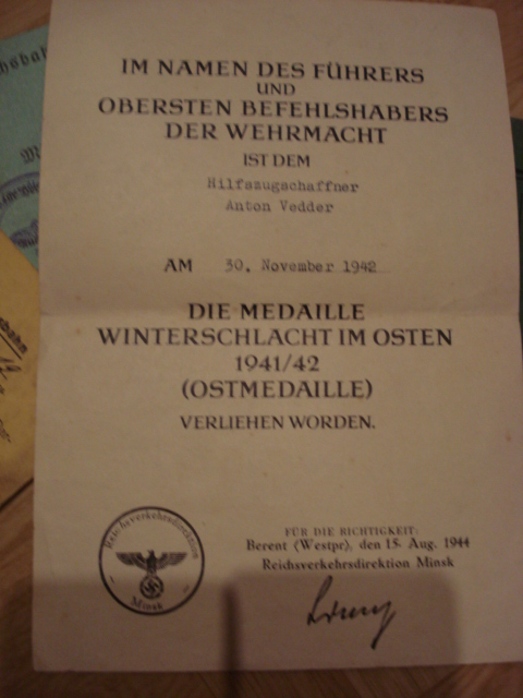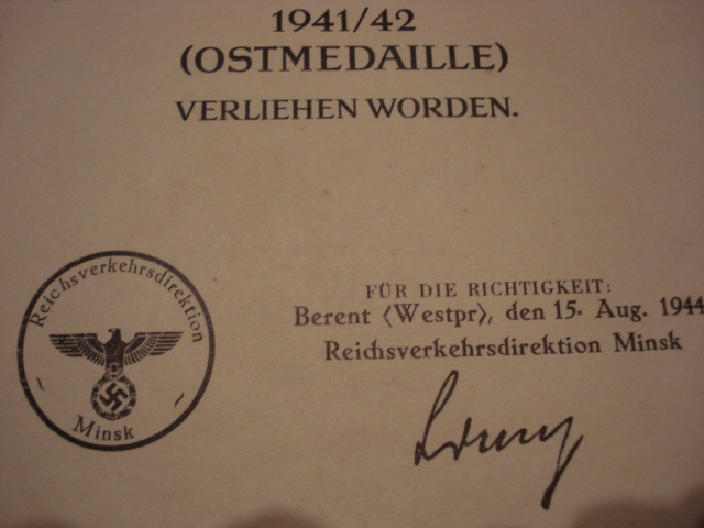 Для того, чтобы не делать скоропалительных выводов и понять что к чему, необходимо всего лишь прочитать документы, а не отдельный фрагмент одного из них. Из документов следует, что награжденный является служащим железной дороги - Рейхсбана, даже является членом союза железнодорожников. Далее, что касается самого наградного на мясо. Должность награжденного - проводник вспомогательного поезда. Далее по тексту все почему-то игнорируют надпись слева от даты, место выдачи: Berent (Westpr). А внизу указано название организации: Имперское управление транспорта Минск, которое, сохранив название, в июле 1944 уже находилось сначала в Белостоке, затем в Беренте.