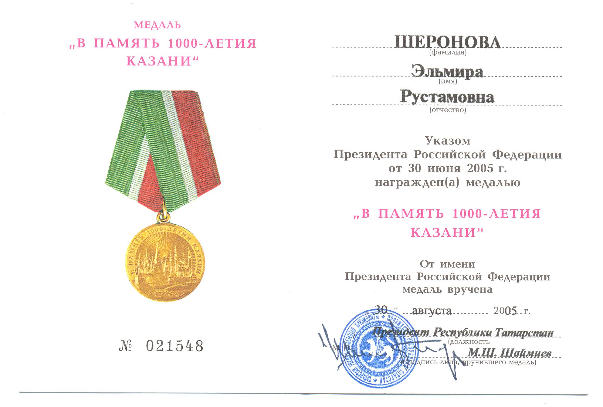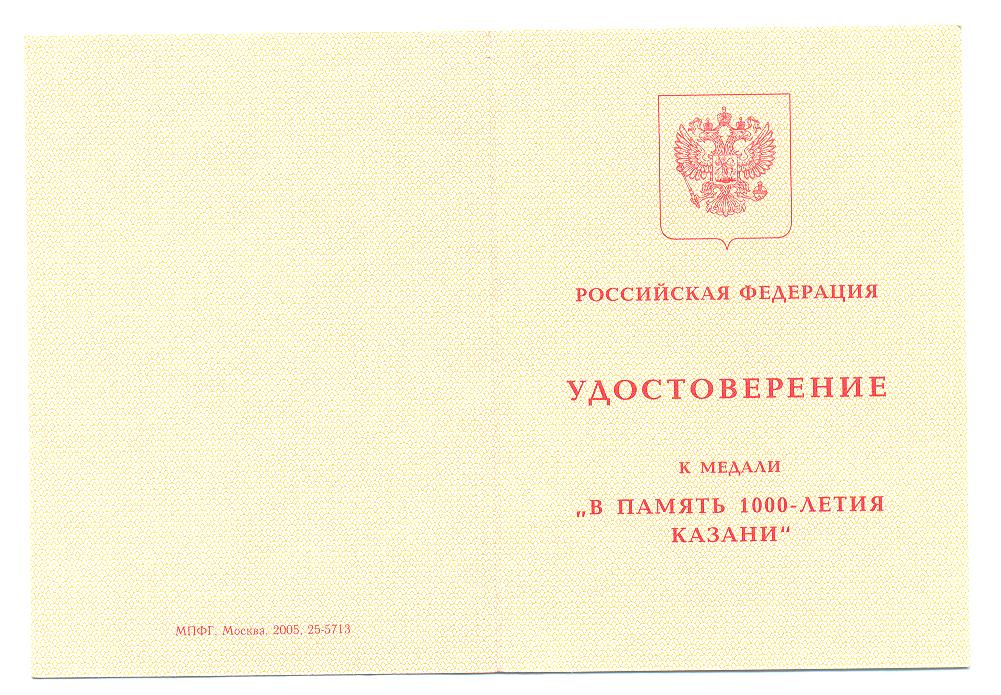 Из самой первой партии, с подписью Президента Татарстана Шаймиева, в самый первый день вручения 30.08.2005 - первый день празднования 1000-летия Казани!!!