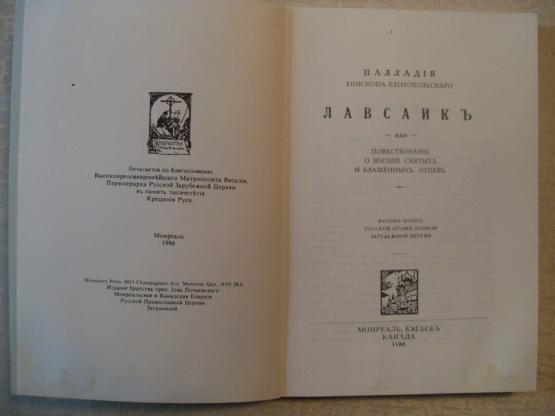 Палладия епископа Еленопольскаго " ЛАВСАИКЪ или повествование о жизни святыхъ и блаженныхъ отцевъ ". Монреаль,Квебек Канада 1985г.