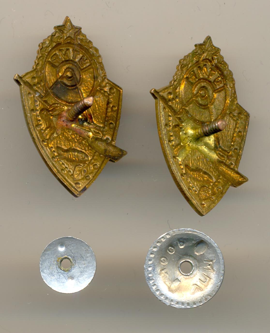 тяжёлые значки с эмалью и позолотой и винт а ля до военные...гайки не родные наверно.но находят отлично...