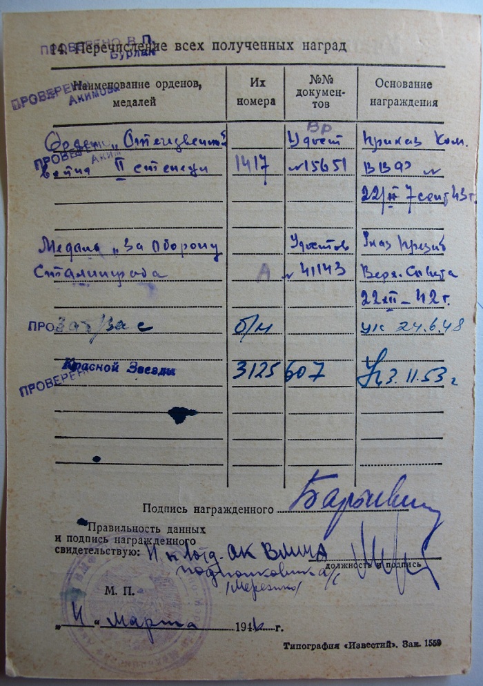 Красного Знамени, Суворова, Кутузова, Богдана Хмельницкого, Александра Невского, Ушакова, Нахимова, Отечественной Войны, Красной Звезды, Славы, За Службу Родине в ВС СССР