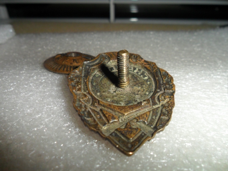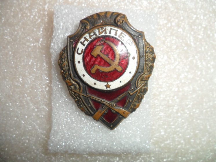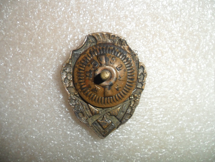 Военный знак, скол красной эмали над молотком, справа от серпа и слева вверху от медальона, скол белой эмали на 12 часов, гайка ШМЗ НКПС, люфтит, резьба была перерезана (тип 5 по Хламкину).