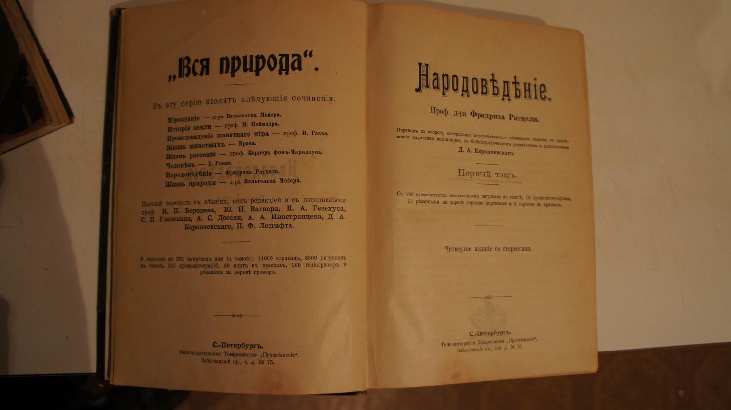 Том 1 - с 590 художественно исполненными рисунками в тексте, 15 хромолитографиями, 13 резанными на дереве черными картинами 2 двумя картами к красках. Том 2 - с 513 художественно исполненными рисунками в тексте, 15 хромолитографиями, 13 резанными на дереве черными картинами и 4 картами в красках. «Народоведение» - это капитальный труд по этнографии народов мира, выполненный с немецкой точностью и основательностью. Его автор - Фридрих Ратцель (1844_1904) - крупнейший географ, путешественник, натуралист, профессор Лейпцигского университета. Одной из главных тем для исследователя было изучить вопрос о том, как географический фактор и среда обитания влияли на развитие тех или иных антропологических и культурных признаков. По мнению Ф. Ратцеля, «задачей народоведения является прежде всего не указание различий, а указание переходов и внутренней связи» так как «история распространения культуры глубоко проникает в то, что обыкновенно называется народоведением…». Ратцель делит современное человечество на географические «круги народов» и начинает с описания народов тихо-океанско-американского круга, куда входят представители и жёлтой, и чёрной рас, затем рассматривает светлокожие народы Южной Америки, негрские народы и, наконец, «культурные народы Старого Света».