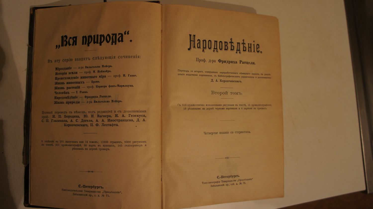 Фридрих Ратцель. Народоведение в 2 томах -прижизненное издание автора. Выпущено в 1896 году в Типографии Товарищества "Просвещение", Санкт-Петербург. В двух томах. Перевод со 2-го, совершенно переработанного немецкого издания, с разрешения издателей подлинника, с библиографическим указателем и дополнениями Д. А. Коропчевского.