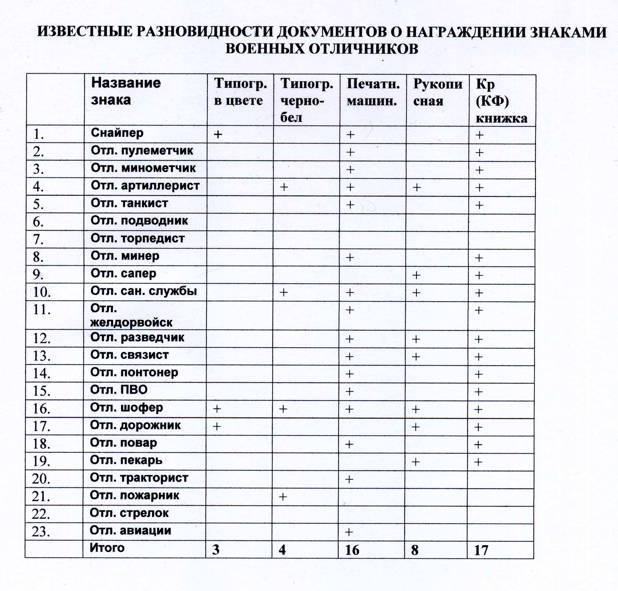 Прошу критически посмотреть мою таблицу, при желании уточнить ее или высказаться. Готовится к выпуску в свет Каталог "ДОКУМЕНТЫ К НАГРУДНЫМ ЗНАКАМ ВОЕННЫХ ОТЛИЧНИКОВ И ИХ ФОТОГРАФИИ (1942-1957 гг.)