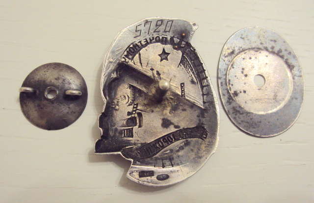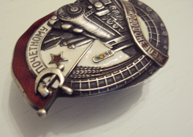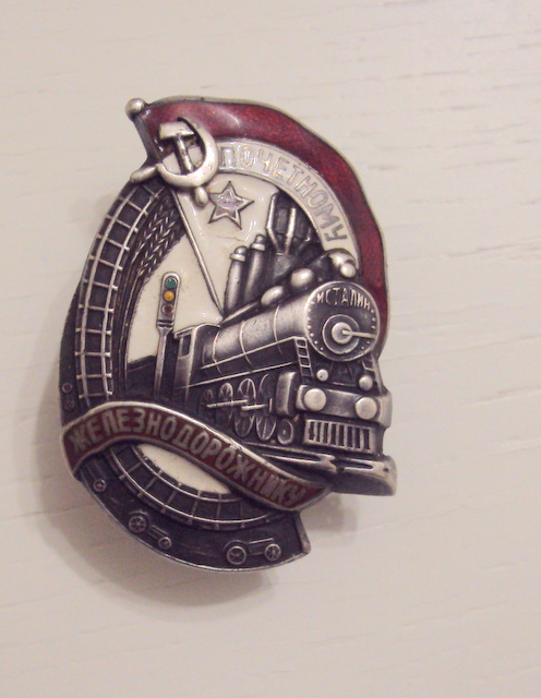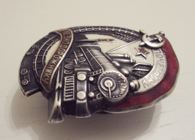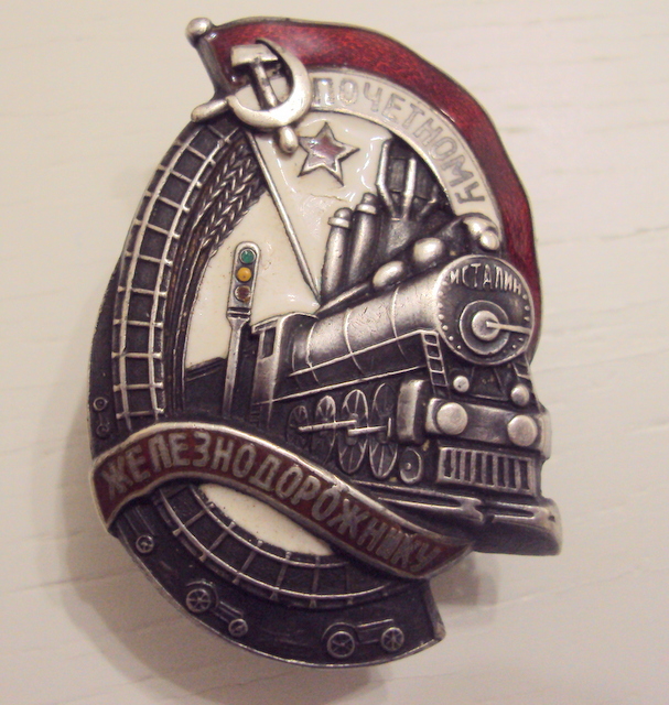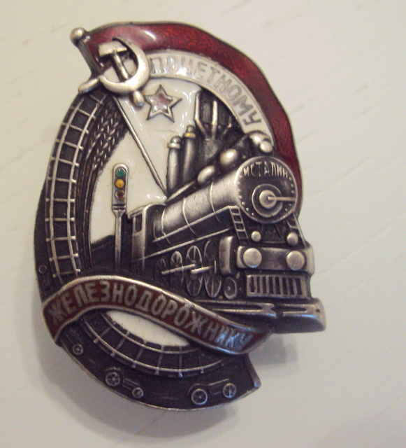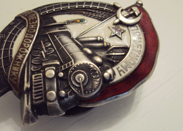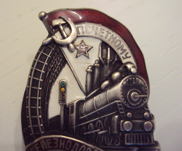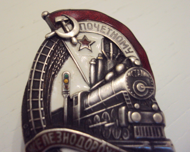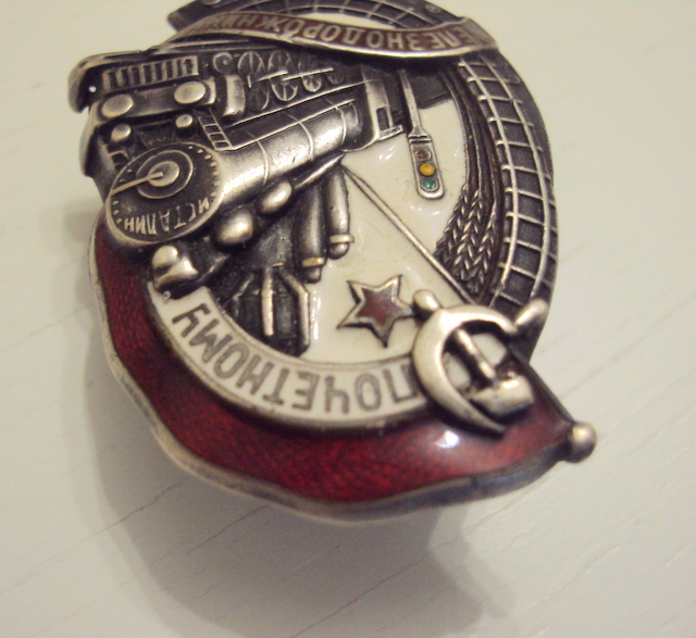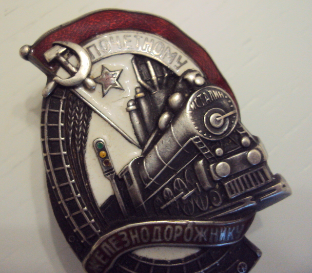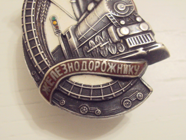 красная эмаль, лента ЖЕЛЕЗНОДОРОЖНИКУ, небольшой скольчик над буквами "И" и "К, по ЗНАМЕНИ, следы времени.