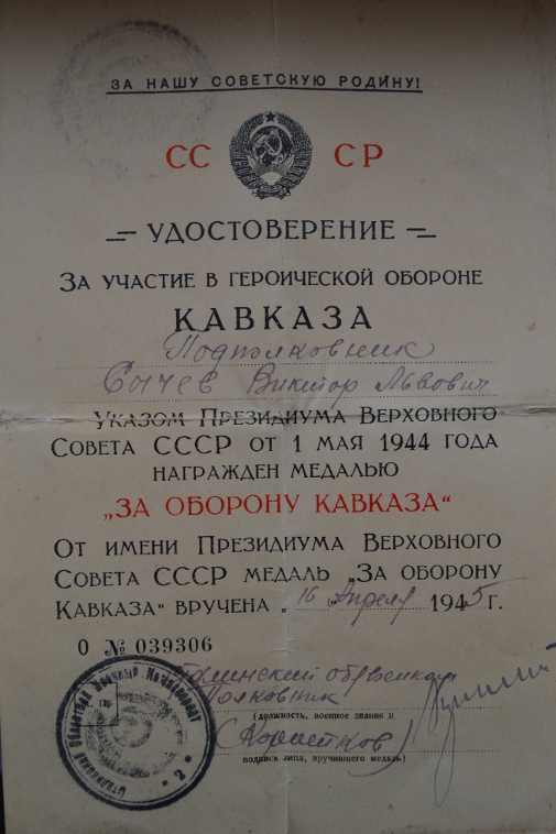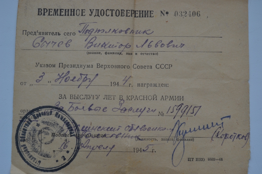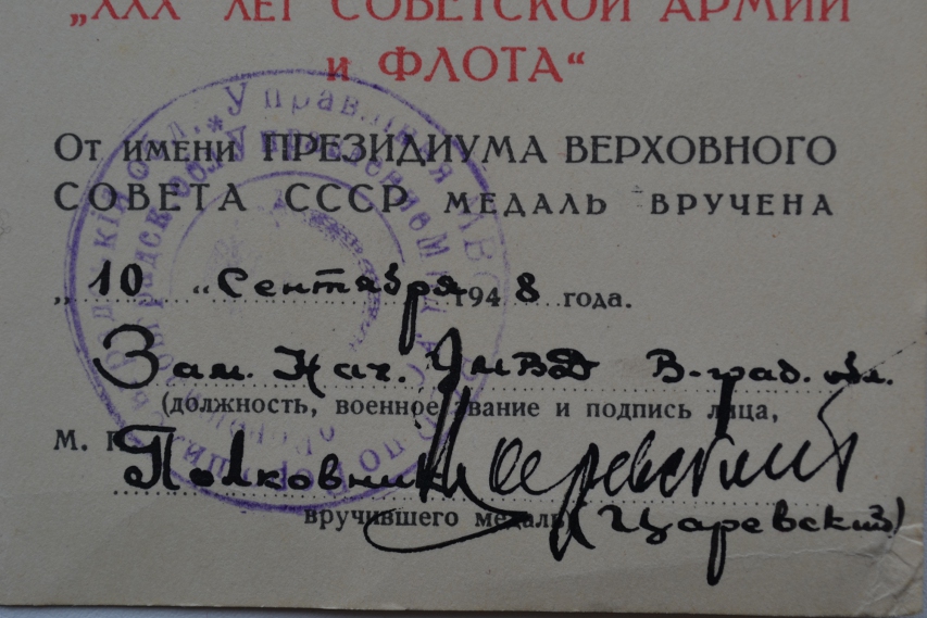 Всё на сканах.Не пробивается по ЦАМО.Во время ВОВ в НКВД.После ВОВ был нач.лагеря для военнопленных в Ворошиловоградской обл.(ныне Луганская обл.).Информация получена от внука кавалера.В удостоверении к медали "ХХХ лет Сов.армии флота" печать УМВД той самой Ворошиловоградской обл. Скан выставлю завтра,сегодня уже темновато для фотосъёмки.