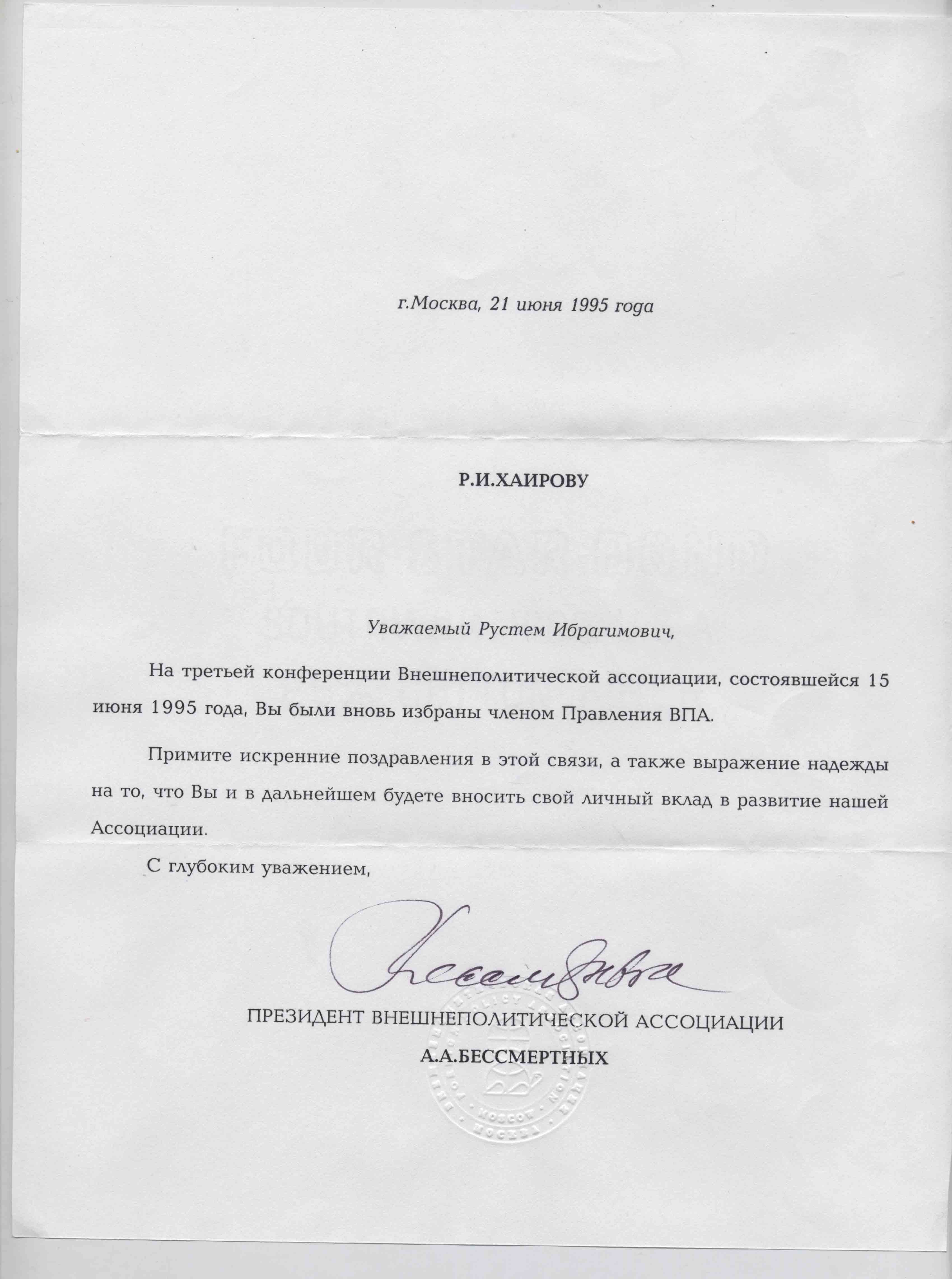 На бумаге формата А4 с водяными знаками и тисненой рельефной печатью, живая подпись как президента Внешнеполитической ассоциации (1995).