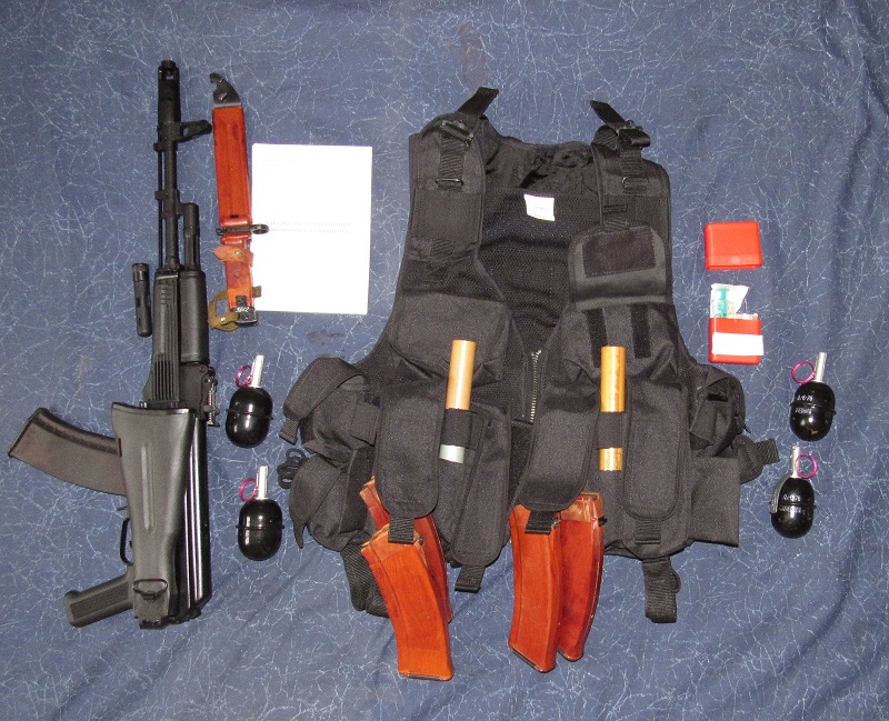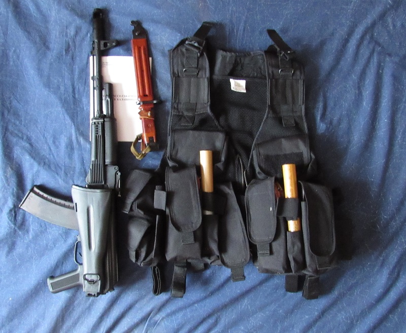 Классический набор русского силовика, правда частенько у них еще подствольники есть, но не у всех. Надевается кевларовый шлем, броник, маска, разгрузка, перчатки. Пистолет на бедро.