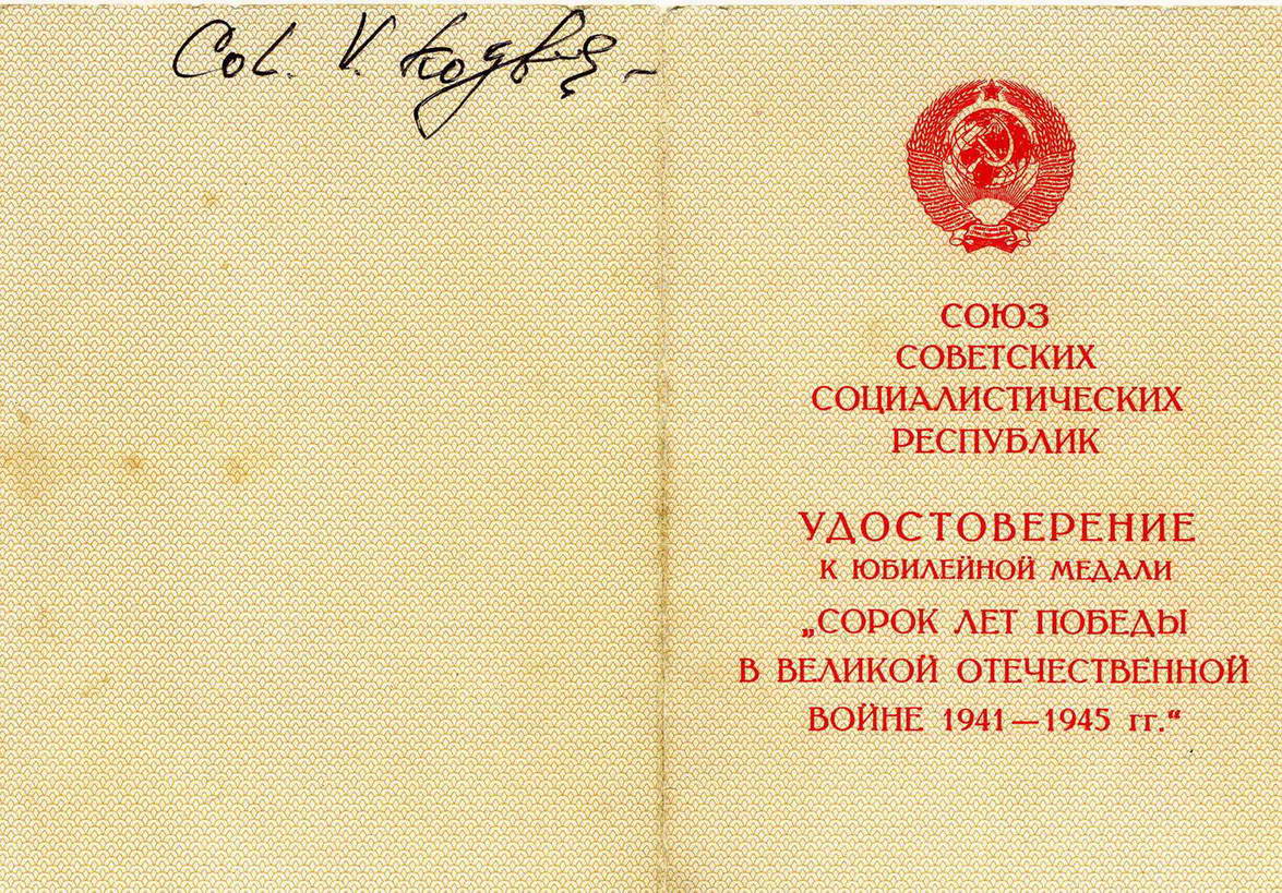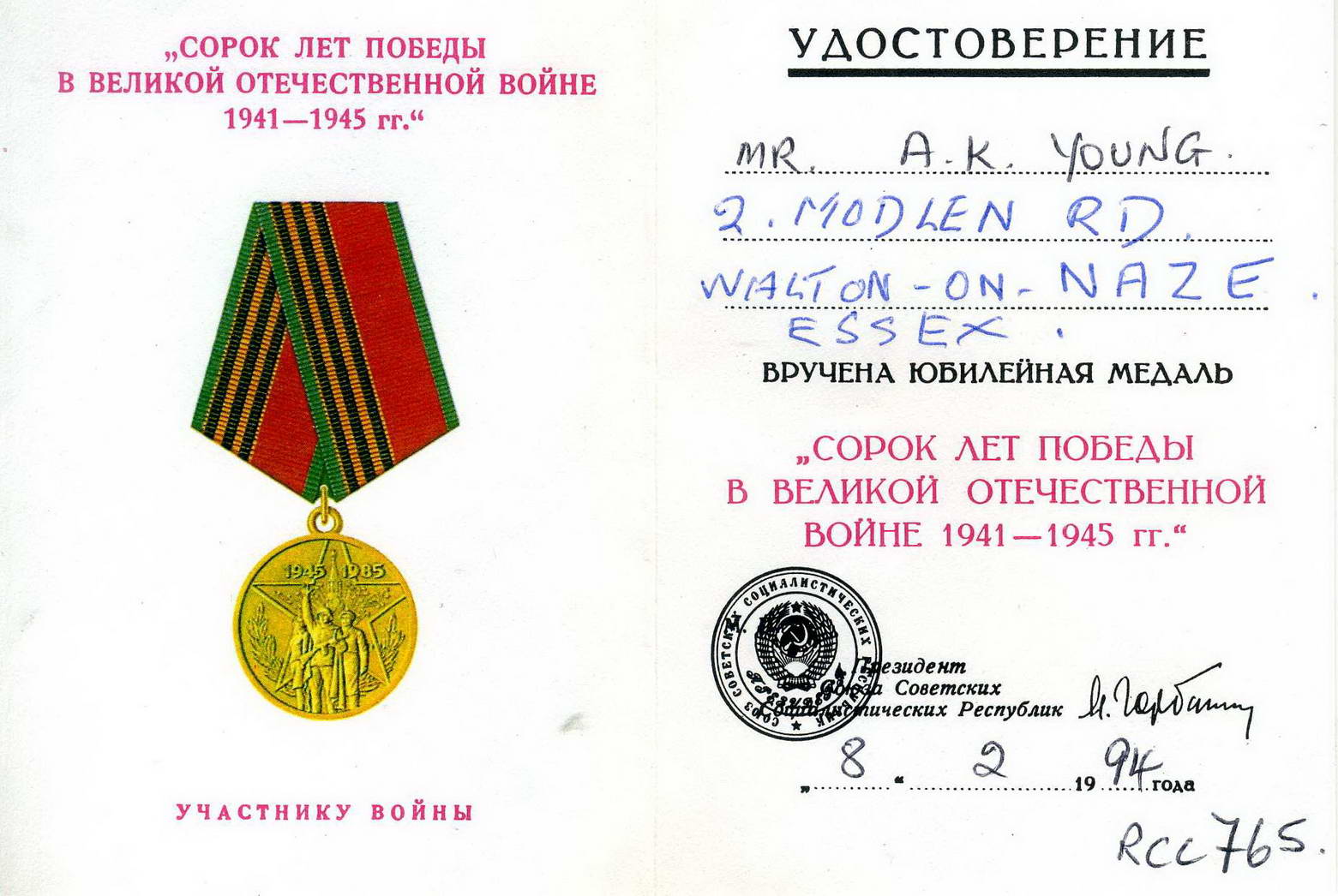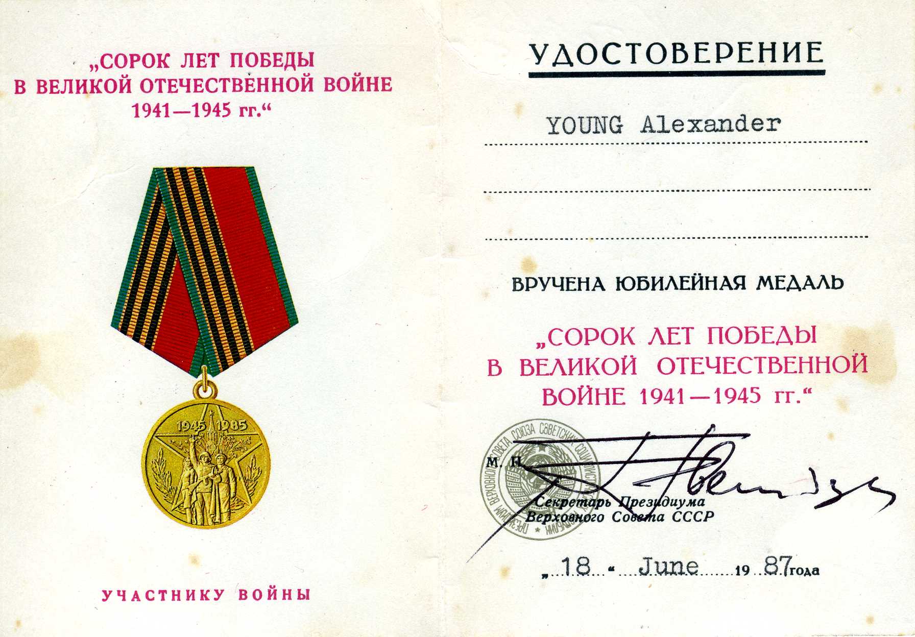 К вашему вниманию RRR 40 лет победы на англичанина - двойное награждение , два разных удостоверения. Награжденный Alexander Young.