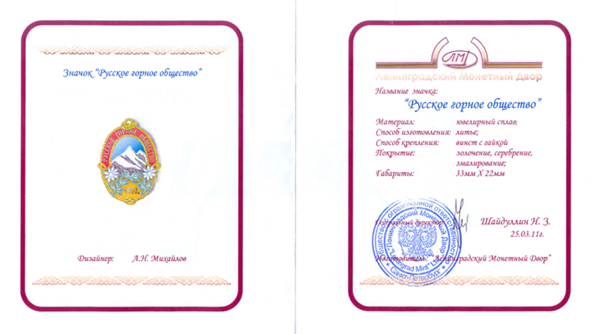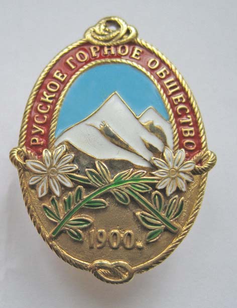 Знак выпущен к 110-летию общества. Ювелирный сплав (тяжелый металл). Литье. Винт с гайкой. Покрытие - золочение. Эмаль 4-х цветов. Эдельвейсы - накладка. Размер 22х33 мм. Изготовлен на Ленинградском монетном дворе. Сертификат. Всего было сделано 100 шт. С номерами: №№ 31-39,41-49.