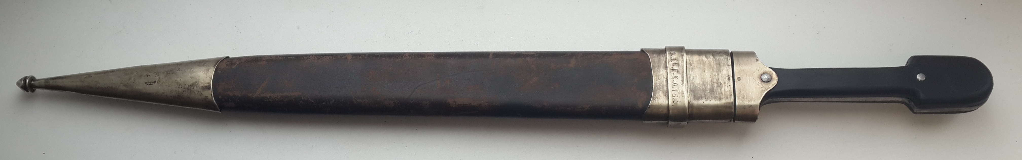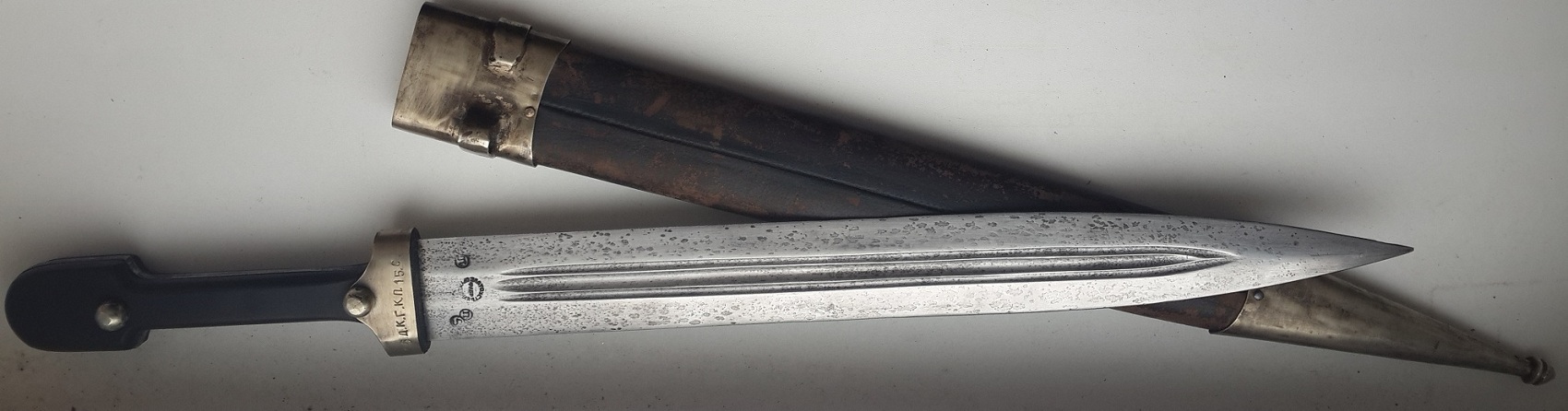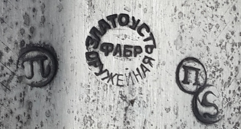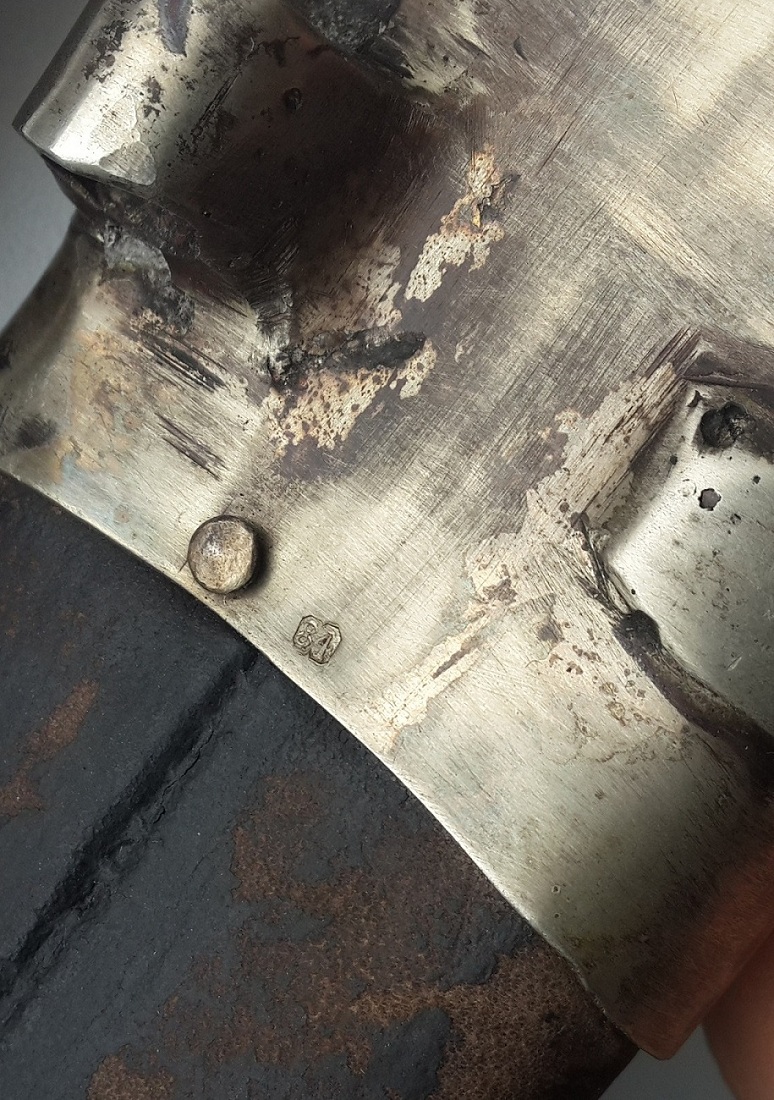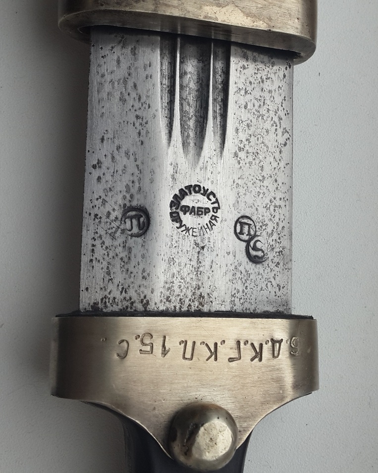 "Сей кинжал ценен ранним клеймом, ранним выпуском и отношению к генералу Краснову, чей внук в последствии возглавлял казачью армию Вермахта в ВОВ. Клеймо на рукояти читается как - 6 Донской Генерала Краснова Казачий Полк 15 Сотня. Это уставной донской сотник кавказкого типа обр 1838г. (но выпущен не позднее 1841-42 г., т.к. именно в это время донские полки по командованием Краснова воевали на Кавказе). Клеймо Златоустовской фабрики раннее от 1838 г (позднее клеймо с орлом в центре идет с 1881 г.). "S" - личное клеймо приемщика Шлиппера. "П"-шки -это военная приемка. Клейма битые на горячую, на обратной стороне все видно. Обратите внимание на долы (в народе - кровостоки) - они бывают имеют неровности и разную длину, т.к. в России до революции не было машинной ковки и долы прорезались одним движением. В Европе уже с середины 19 века ковали свое барахло машинами. Серебро, буйволиные рукоять и кожа, булат слоеный, сохран шикарный."