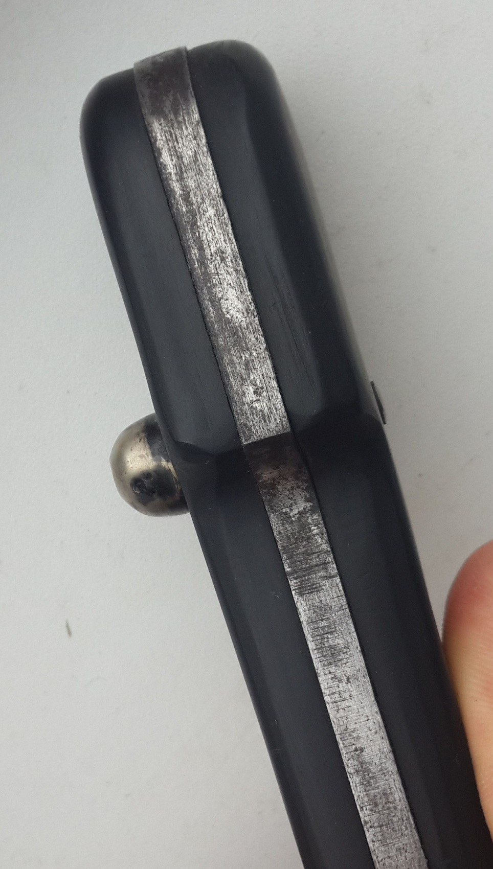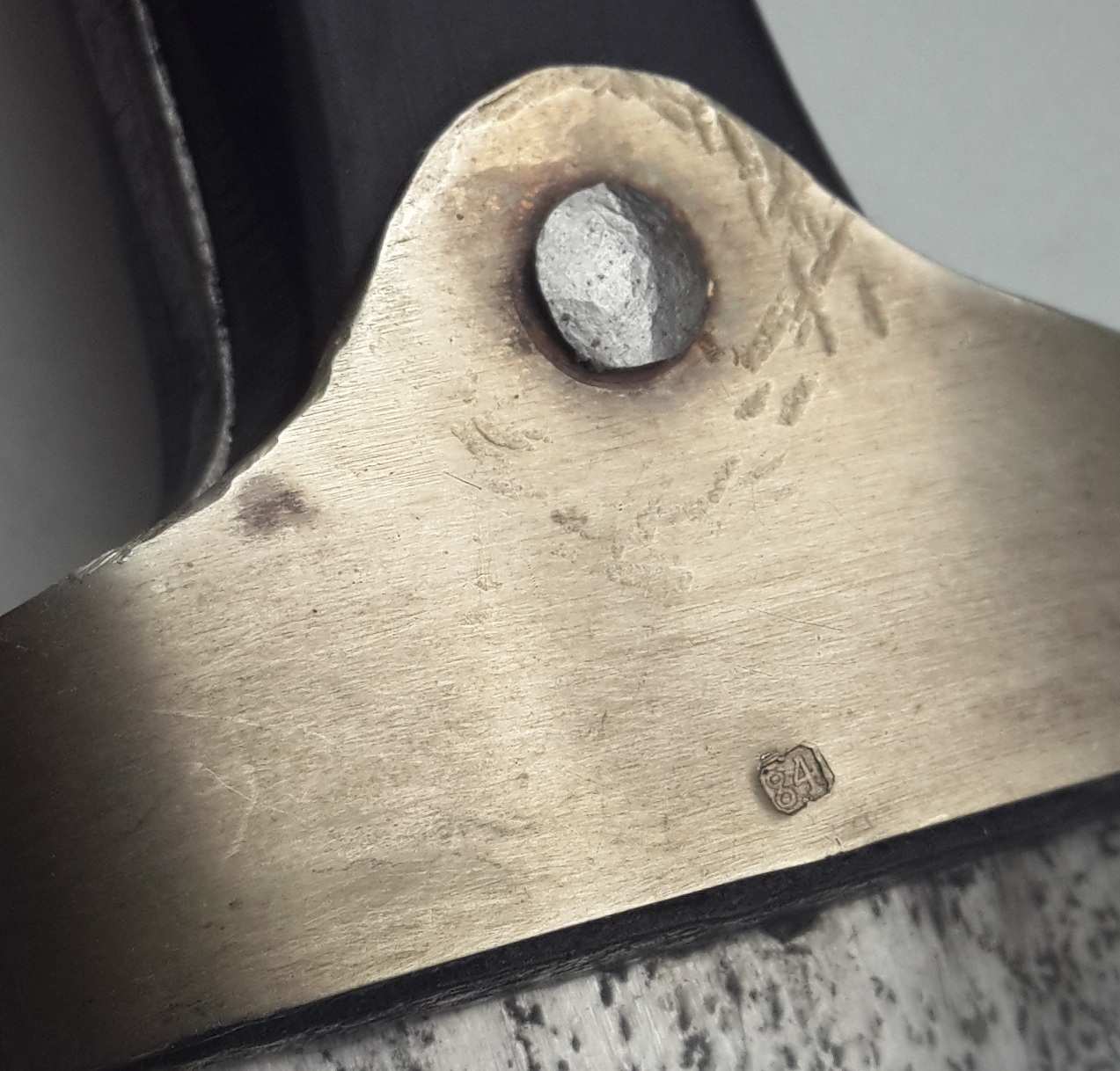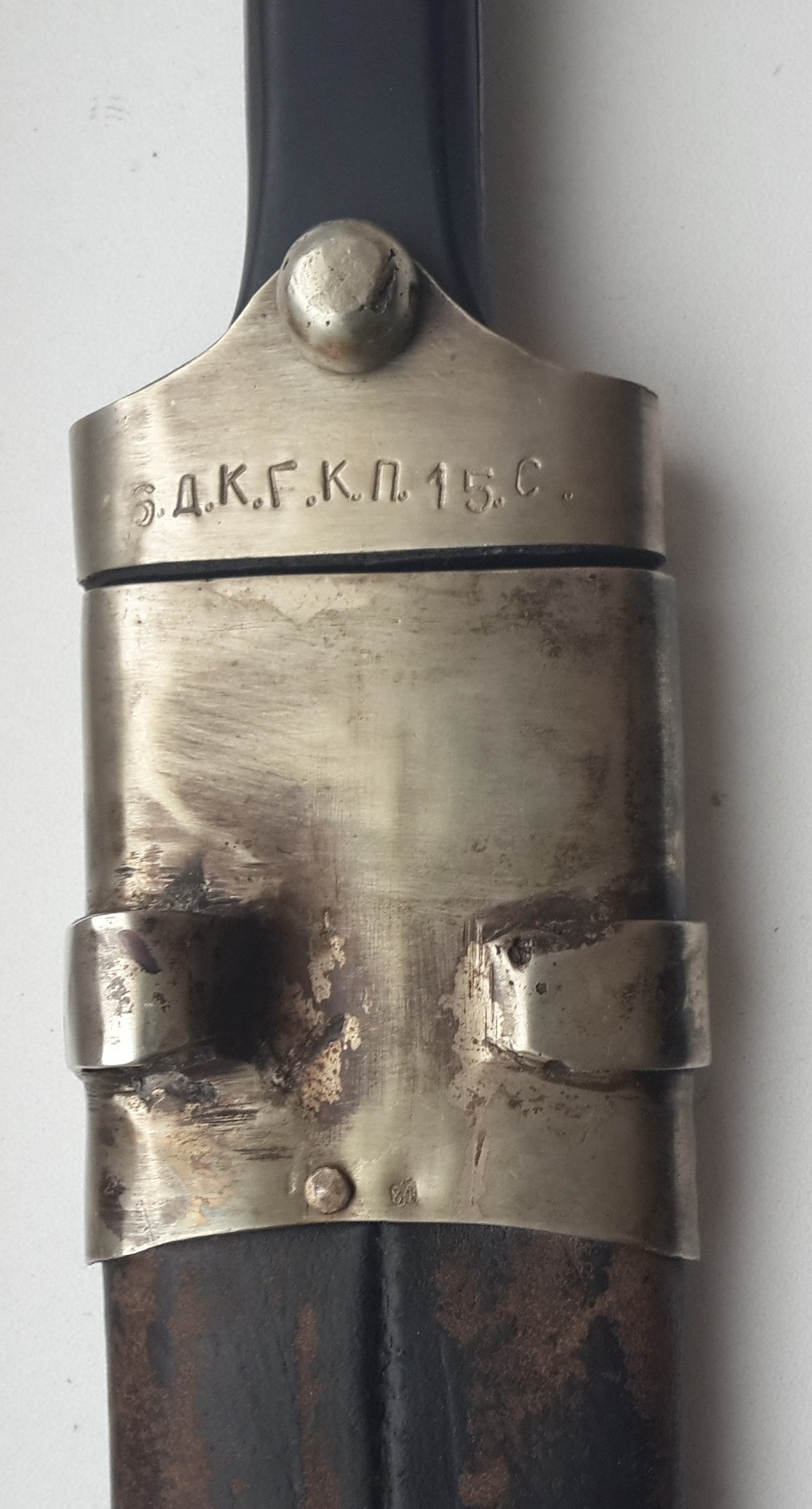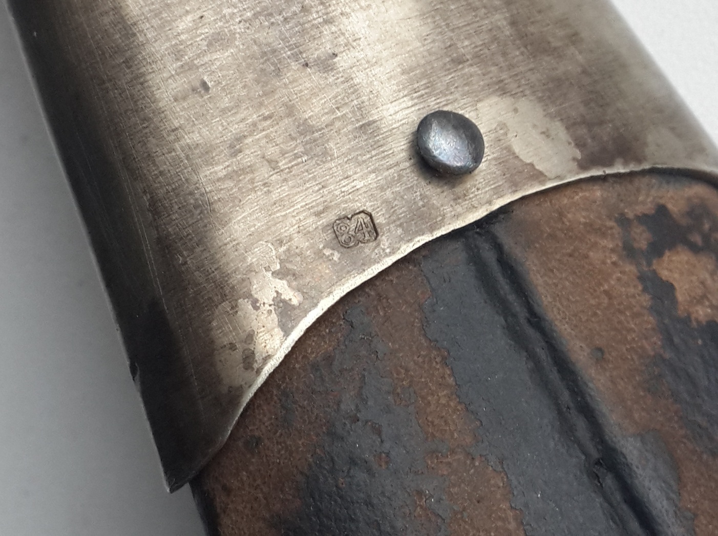 "Сей кинжал ценен ранним клеймом, ранним выпуском и отношению к генералу Краснову, чей внук в последствии возглавлял казачью армию Вермахта в ВОВ. Клеймо на рукояти читается как - 6 Донской Генерала Краснова Казачий Полк 15 Сотня. Это уставной донской сотник кавказкого типа обр 1838г. (но выпущен не позднее 1841-42 г., т.к. именно в это время донские полки по командованием Краснова воевали на Кавказе). Клеймо Златоустовской фабрики раннее от 1838 г (позднее клеймо с орлом в центре идет с 1881 г.). "S" - личное клеймо приемщика Шлиппера. "П"-шки -это военная приемка. Клейма битые на горячую, на обратной стороне все видно. Обратите внимание на долы (в народе - кровостоки) - они бывают имеют неровности и разную длину, т.к. в России до революции не было машинной ковки и долы прорезались одним движением. В Европе уже с середины 19 века ковали свое барахло машинами. Серебро, буйволиные рукоять и кожа, булат слоеный, сохран шикарный."
