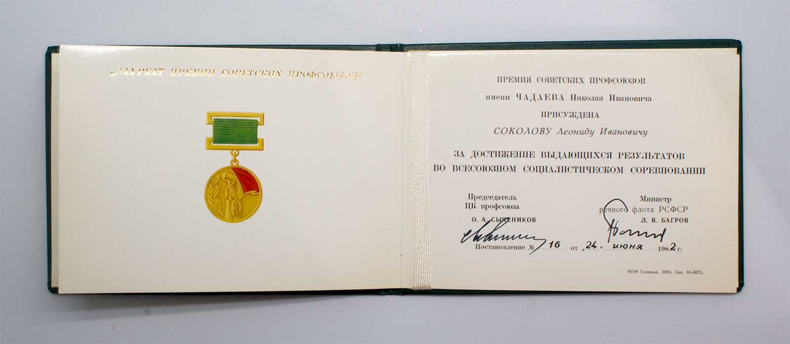В 1982 году капитану Леониду Соколову было присвоено звание лауреата премии Советских профсоюзов имени капитана Чадаева. А через год, в 1983 году, Леонид Иванович стал лауреатом Государственной премии СССР. За высокие достижения в труде Леонид Иванович награжден орденом Трудового Красного Знамени и многими медалями.