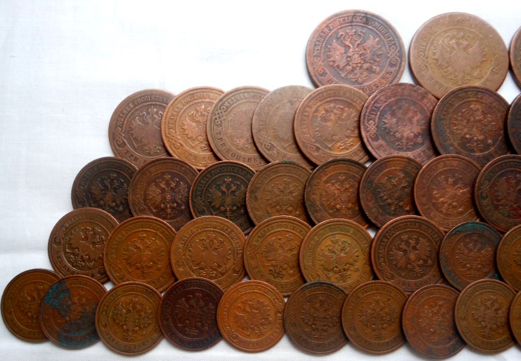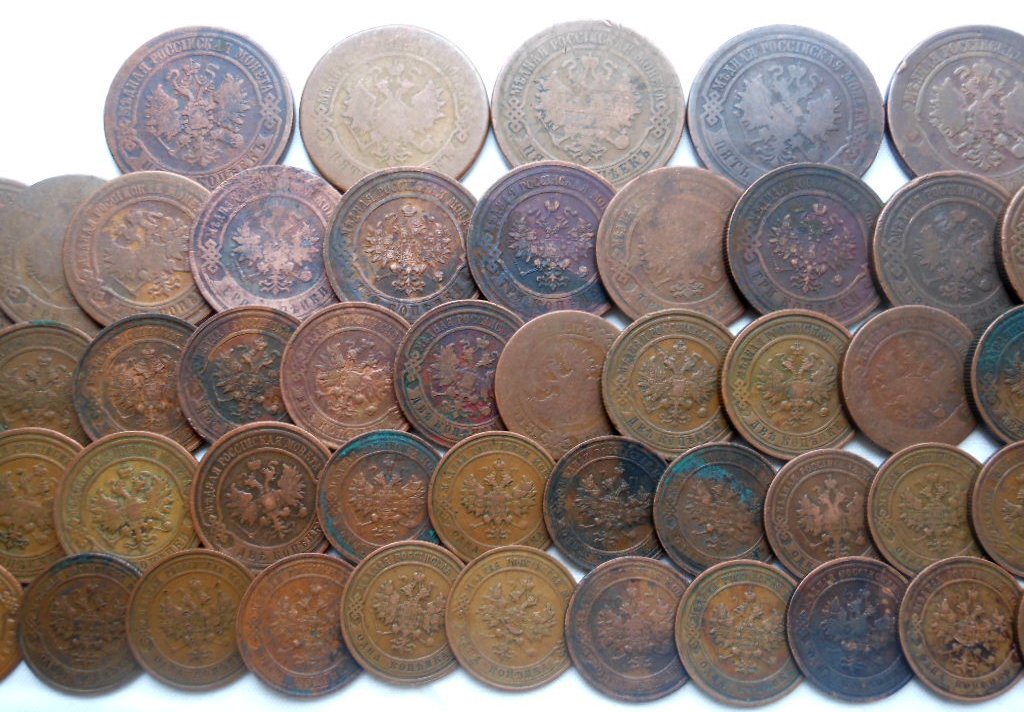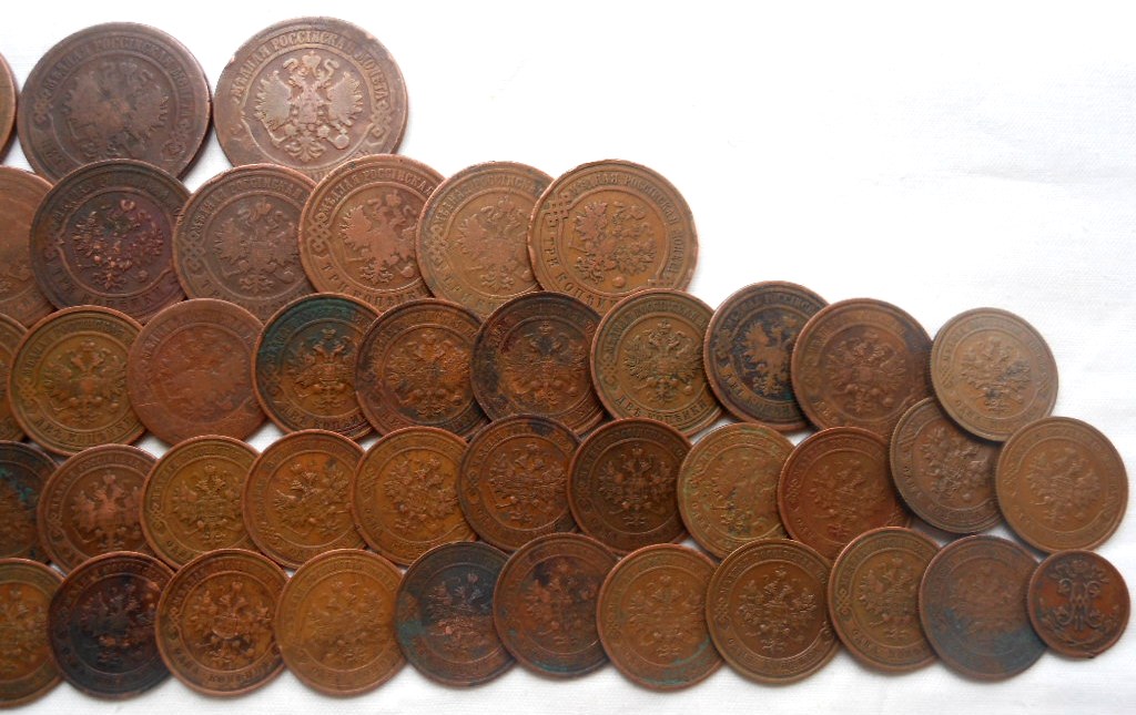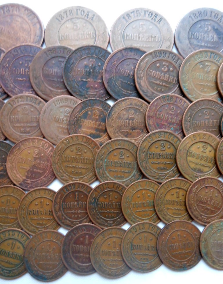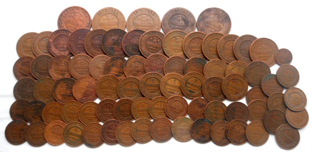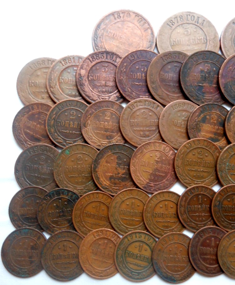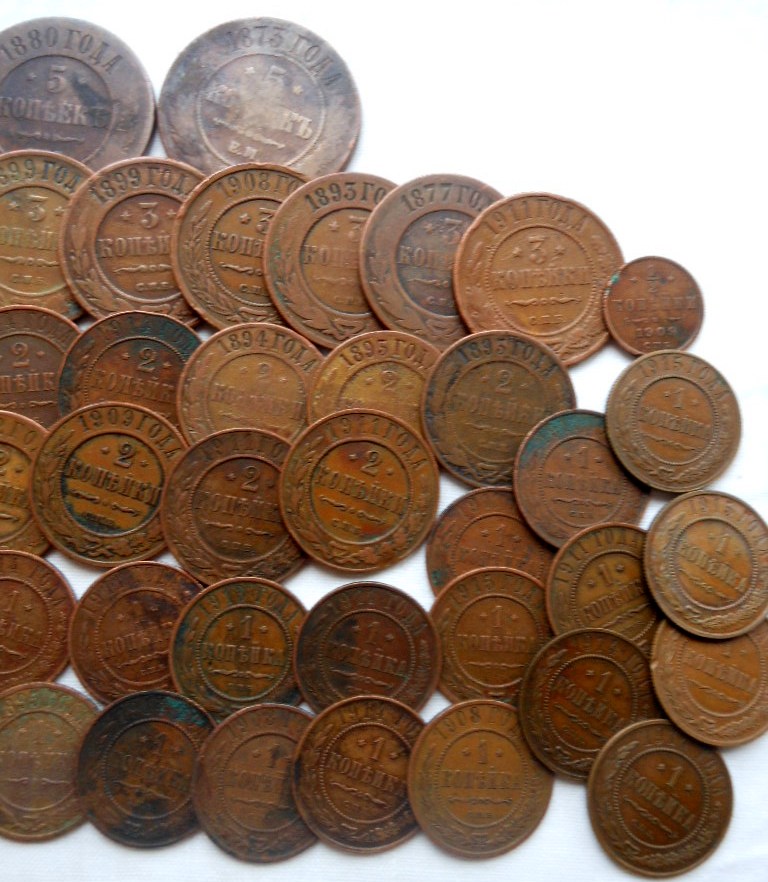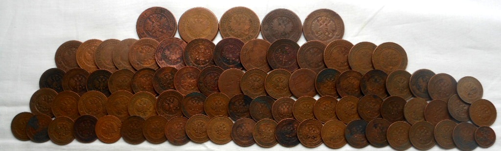 1/2 коп.- 1 шт., 1 коп.- 36 шт., 2 коп.- 24 шт., 3 коп.- 14 шт., 5 коп.- 5 шт.