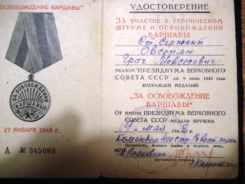 Предложите кому нужно. МПЦ 600 руб. После достижения МПЦ торги 2 суток. Документы в РФ (Москва). Дополнительные фото по запросу. Варшава испорчена разными надписями на обложке, другие доки в хорошем состоянии. Если нужны доп фото напишите в личку. На Подвиге народа есть все трое и все трое кавалеры медали За отвагу.