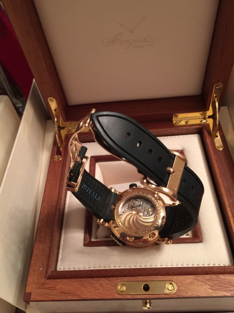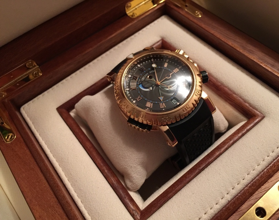 «Морская» коллекция Breguet – одна из самых знаменательных линеек бренда. Начатая в 2004 году, она дала новую жизнь идеям Луи-Авраама Бреге, основателя компании, который с 1815 года являлся единственным официальным поставщиком Французского королевского флота. Почти все модели коллекции выполнены по эскизам самого Луи-Авраама Бреге. Не исключение и модель Marine Royale 5847BR/Z2/5ZV – часы из розового золота с «фирменными» цифрами и ручной гравировкой. Функционально часы предназначены для дайверов. Они водонепроницаемы до глубины 300 метров. Кроме того, часы оснащены будильником. Причем, по результатам тестов, звук будильника распространяется под водой даже лучше, чем на суше. Звуковой сигнал включается и выключается кнопкой на уровне отметки 8 часов, текущая настройка отображается в круглом окошке в направлении 12 часов. Время сигнала устанавливается коронкой на уровне 4 часов и отмечается на циферблате стрелкой с треугольным наконечником. На отметке 6 часов в апертуре показывается текущая дата. В направлении отметки 10 часов находится индикатор запаса завода будильника. Корпус и вращающийся безель выполнены из розового золота 18 карат. Циферблат черный гильошированный, с ручной гравировкой. Калибр механический, 519R, работает на 36 камнях и имеет запас хода на 45 часов, а также частоту колебаний баланса 4 Гц. Ремешок каучуковый, с золотой застежкой.