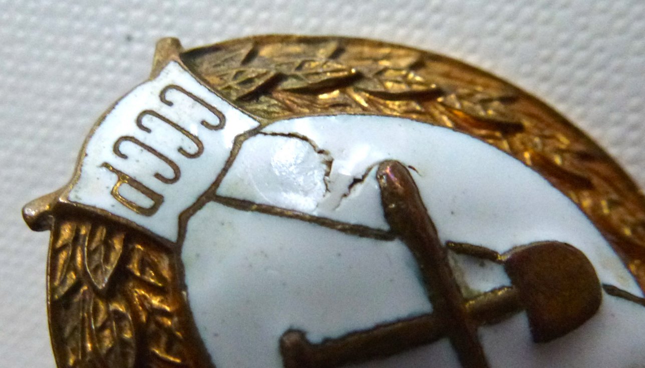 По эмали: Над шильдиком есть парочка трещин и скол.
