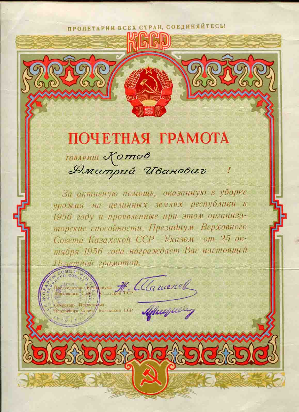 ПОЧЕТНАЯ ГРАМОТА КАЗАХСКОЙ ССР 1956 год boev - 28 мар 2015 18:26.45 × Мини профиль пользователя boev Сообщения: 1783 Зарегистрирован: 17 ноя 2009 22:13.43 Откуда: Украина Статус: Не в сети - 28 мар 2015 18:26.45 #5124668 МПЦ 20 долШаг 5 долдоставка 5 дол Фото Не можете связаться, пишите 1935www@i.ua