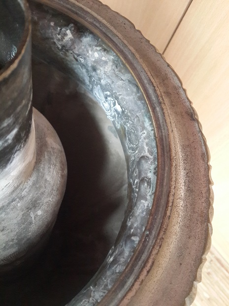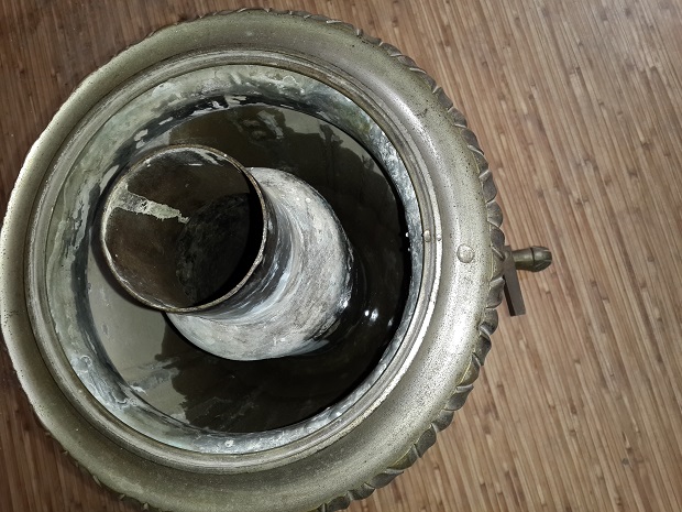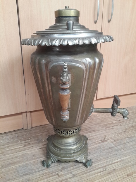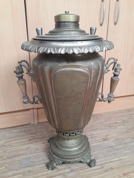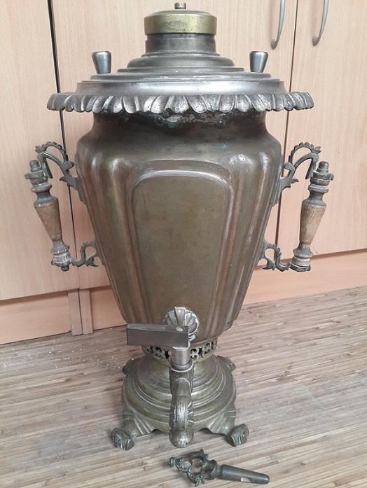 Описание - вмятин и трещин нет(за исключением пайки с верху самовара),не течет,колосники целы,короны нет.Высоту и литраж напишу завтра(на глаз не менее 5 литров).
