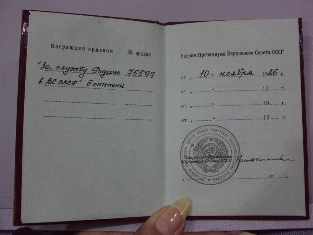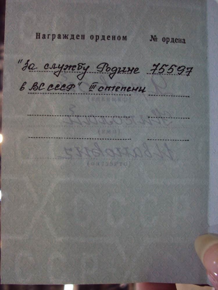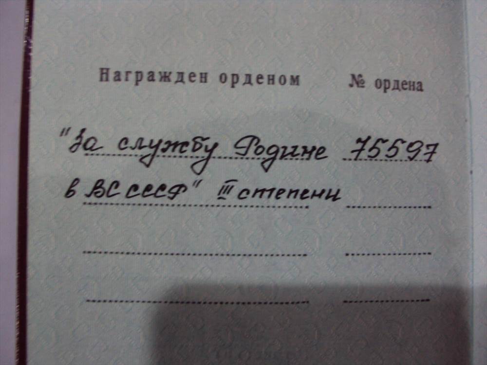 Орден "За службу Родине в ВС СССР" 3 степени № 75597 , Афганский указ, на документе. По легенде на вертолётчика