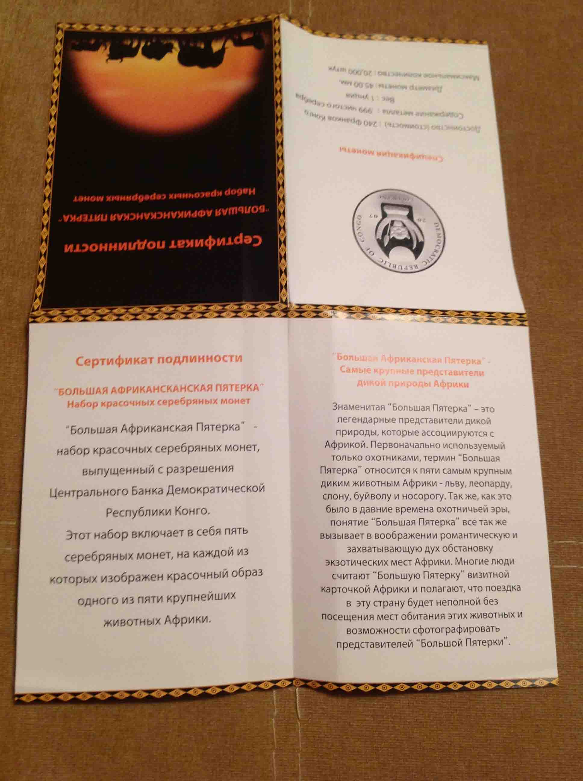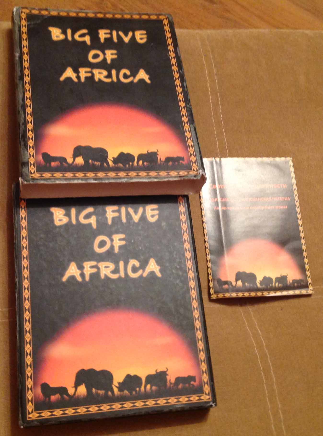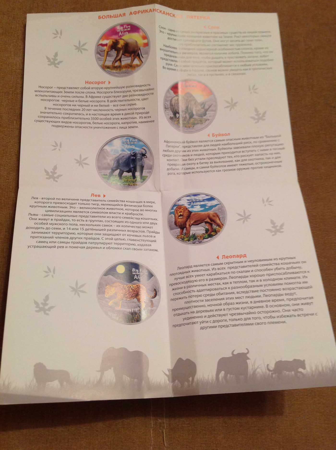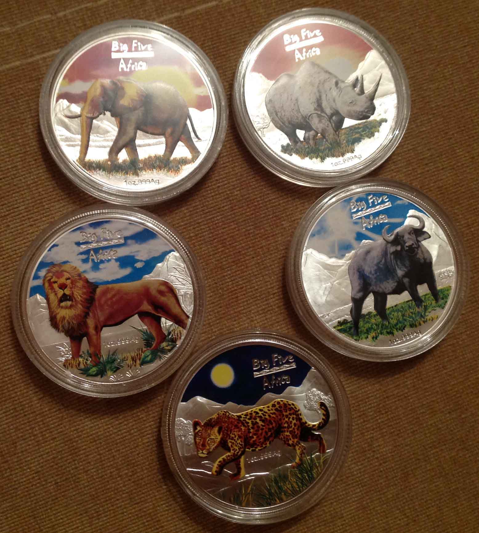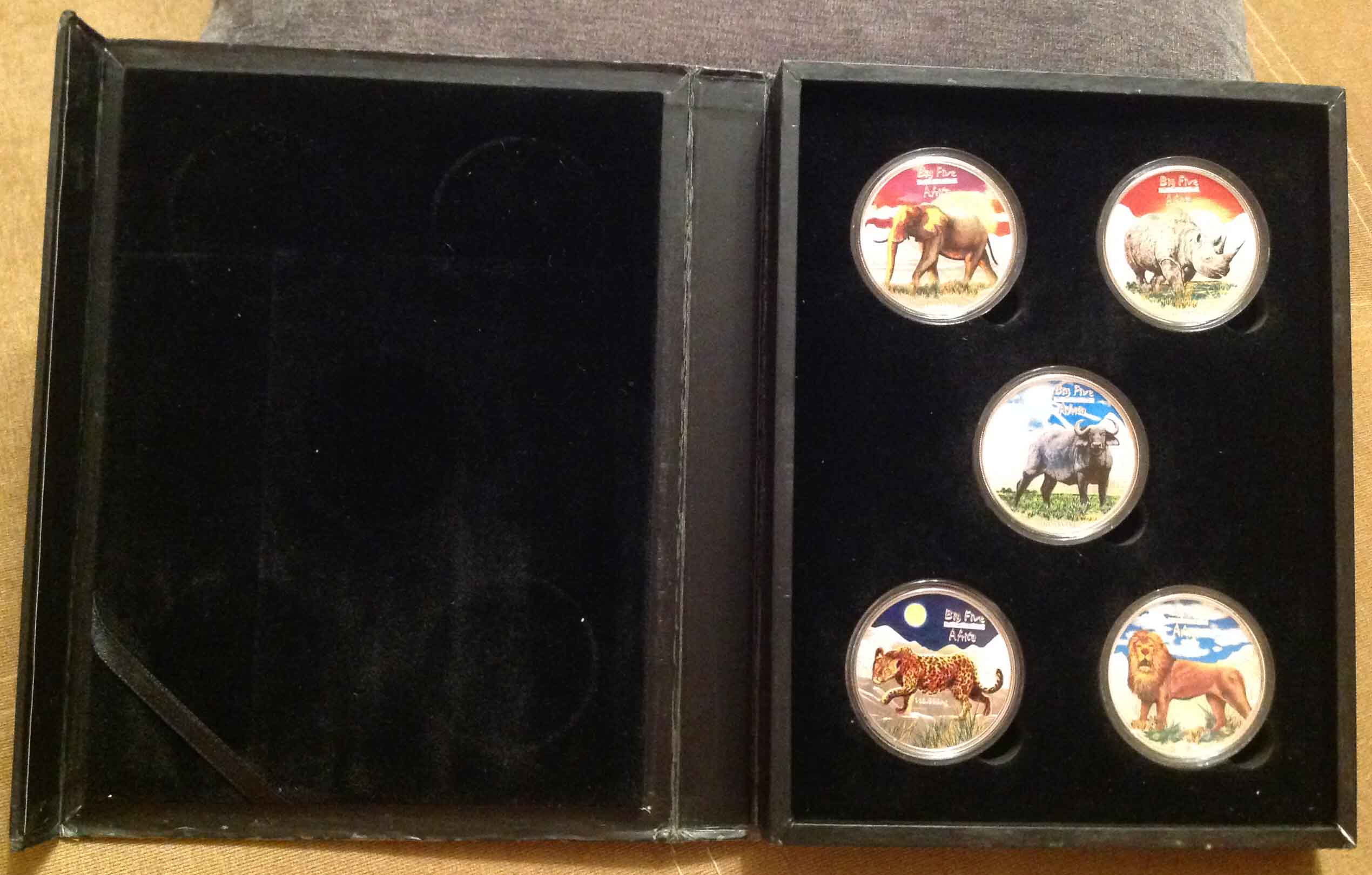 Набор красочных серебряных монет Большая Африканская Пятерка: Слон, Носорог, Буйвол, Лев, Леопард 5 шт х 31,1 гр 999 проба, тираж 20 тыс. шт. Конго оригинальная комплектация: коробочка, сертификат.