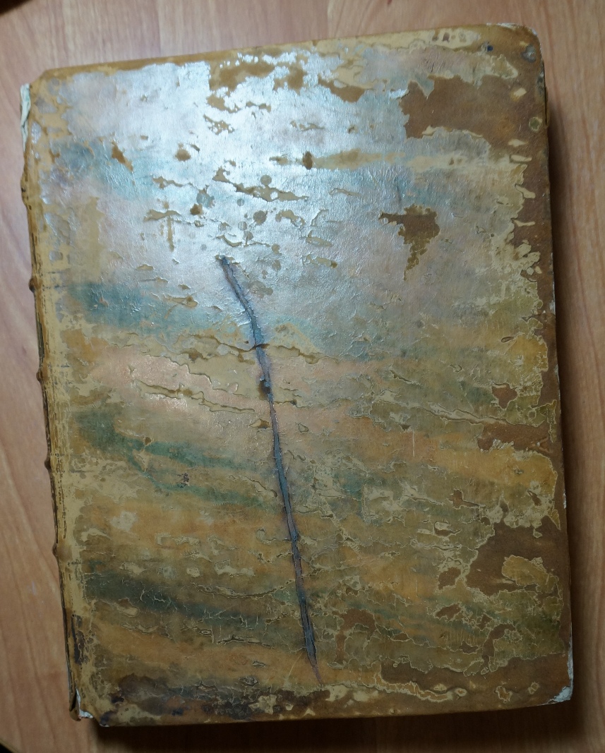 Все листы на месте. Печатей и штампов нет. На одном листе надрыв 4-5 см и оторван небольшой уголок. Недостающий фрагмент корешка 1-го тома прилагается.